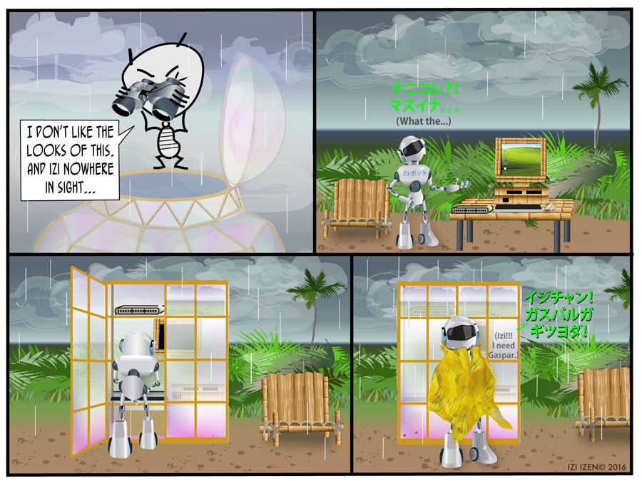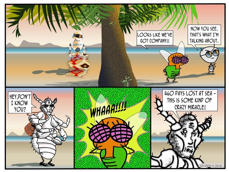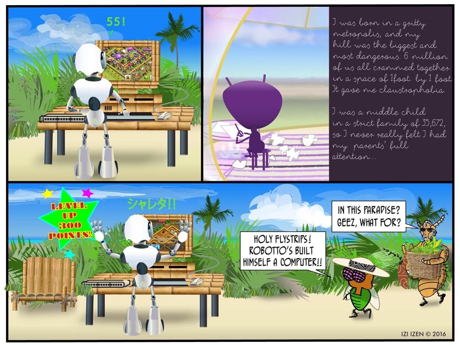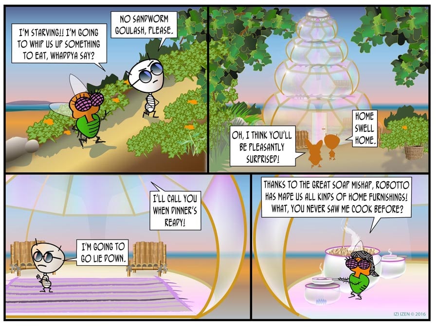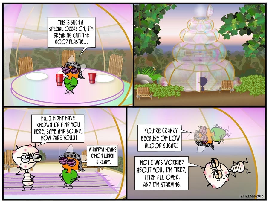 Izi and Co. give up their condo in the city to become "Globe-stas", and wind up on an island, who knows where... In THE BUBBLE CRISIS, Izi tries to humor Ant with a lavish gift which turns out to have some pretty unintended consequences...