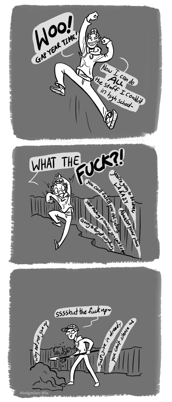Indeed, I'm taking a gap year between high school and college to do a lot of stuff I couldn't do while I was in it because of a program called IB. It wasn't mandatory or anything, but it ended up taking up so much of my free time (and sleep) that I couldn't do stuff I wanted to do, like this comic. But I also happen to be lazy, so I have a few insecurities in regards to my gap year plans.