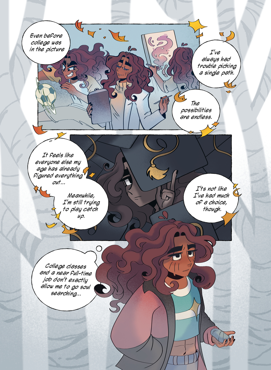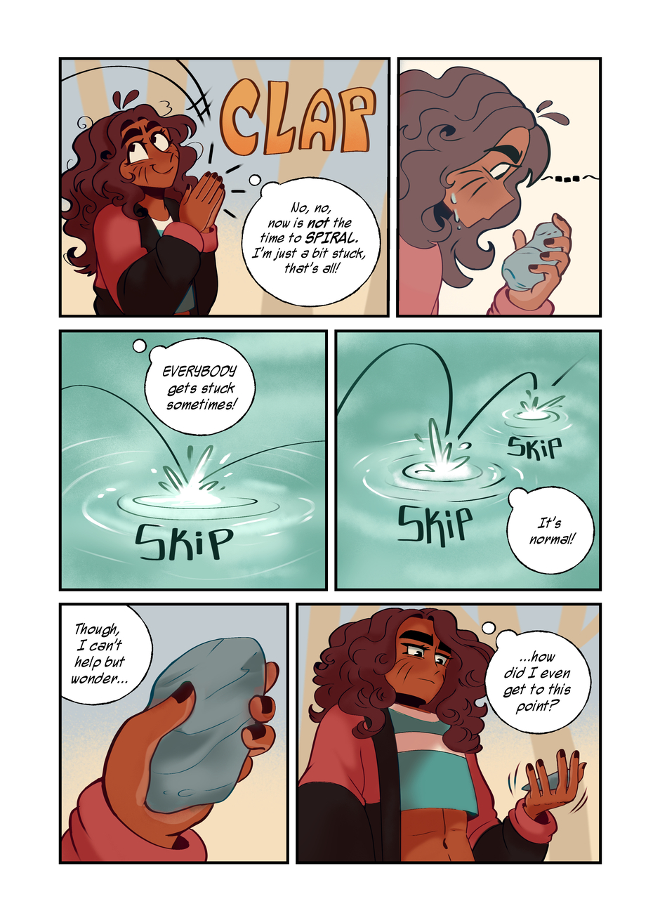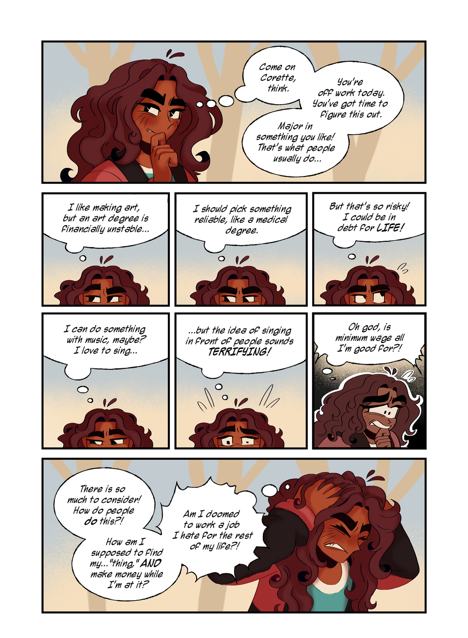 Really digging into some of Corette’s thoughts here, and her involuntarily directionless approach to her life at the moment…I had a lot of fun composing some of these pages, especially the page including scenes of her imagined selves, confident, curious, and creating, meanwhile in reality she’s this huge bundle of fear and doubt.
