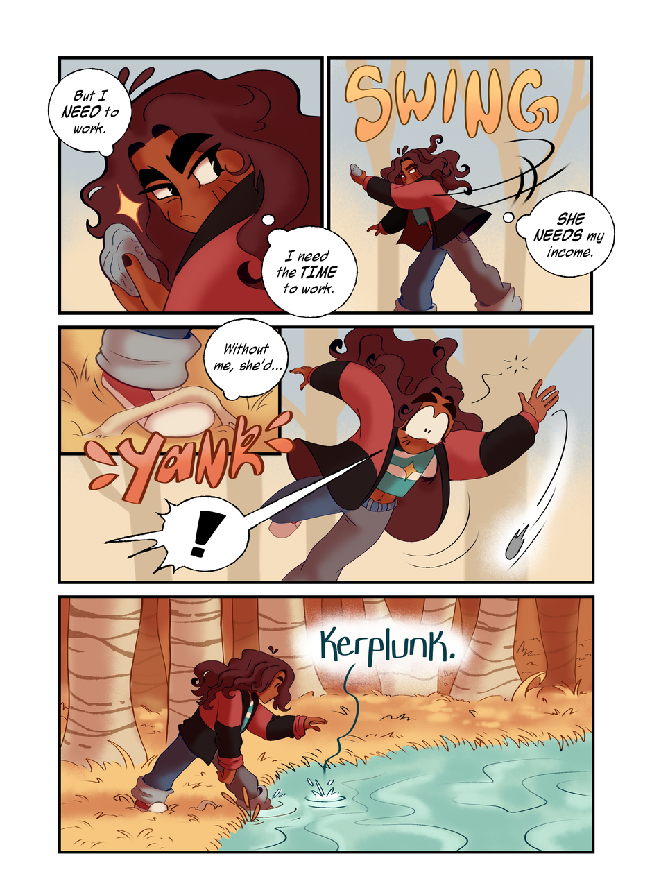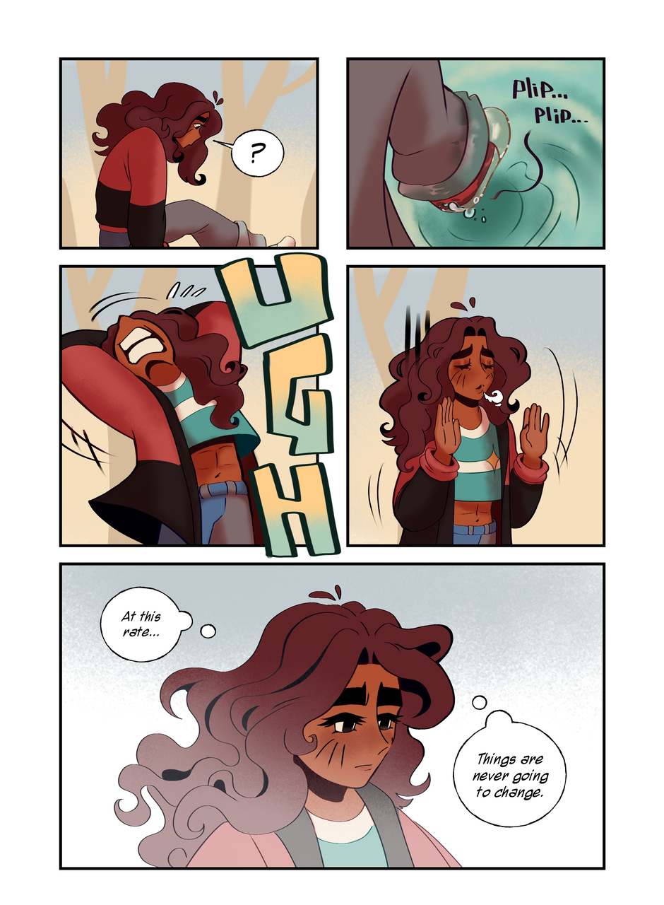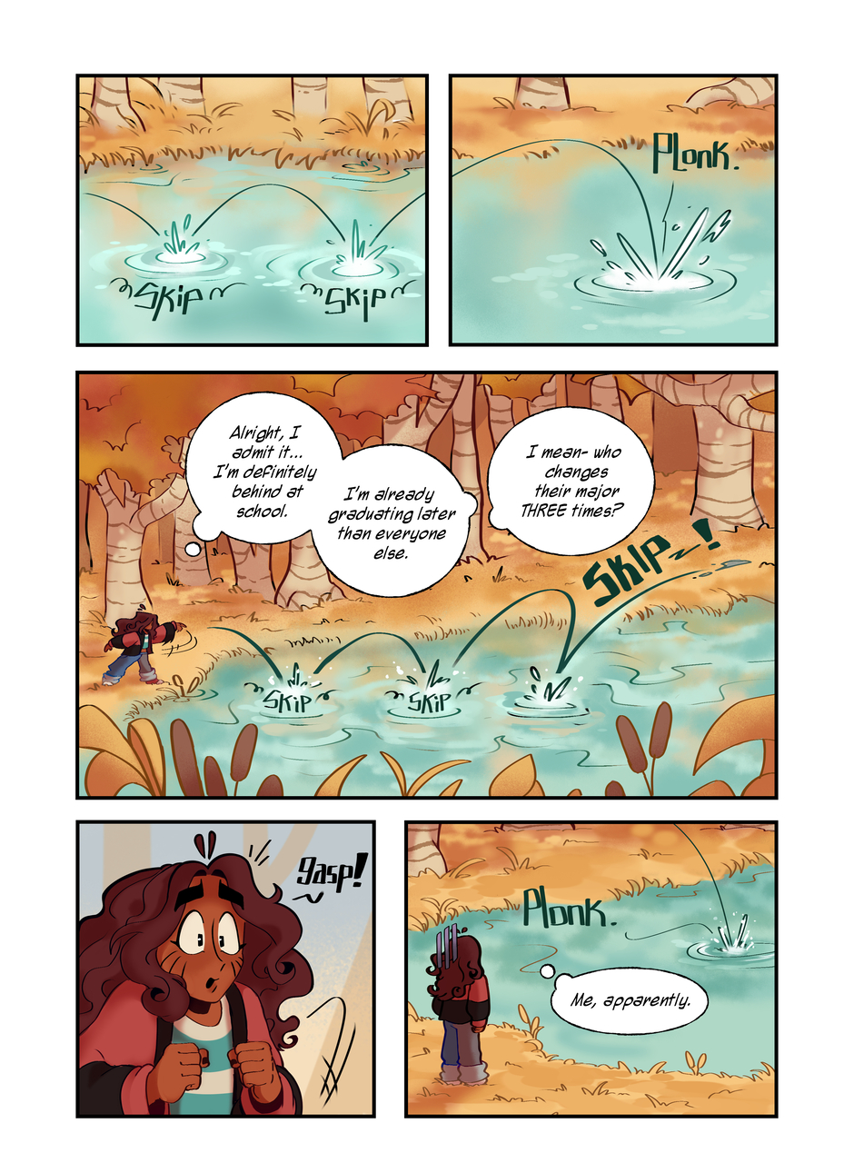 Really digging into some of Corette’s thoughts here, and her involuntarily directionless approach to her life at the moment…I had a lot of fun composing some of these pages, especially the page including scenes of her imagined selves, confident, curious, and creating, meanwhile in reality she’s this huge bundle of fear and doubt.