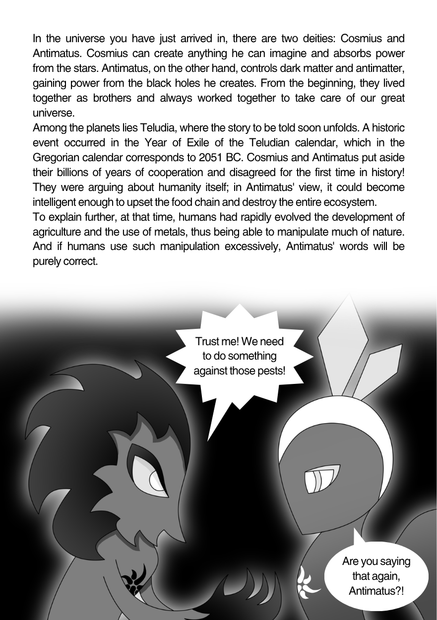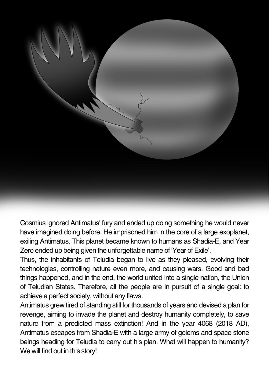 In the year 4068 after the exile (2018 AD), Antimatus, a deity who controls antimatter, broke free from the core of a distant exoplanet called Shadia-E and amassed enough power to carry out his plan for revenge against humanity's evils. When Cosmius, his former partner, realized that he was coming, he summoned three pure-hearted humans to prove to Antimatus that the planet still had hope.