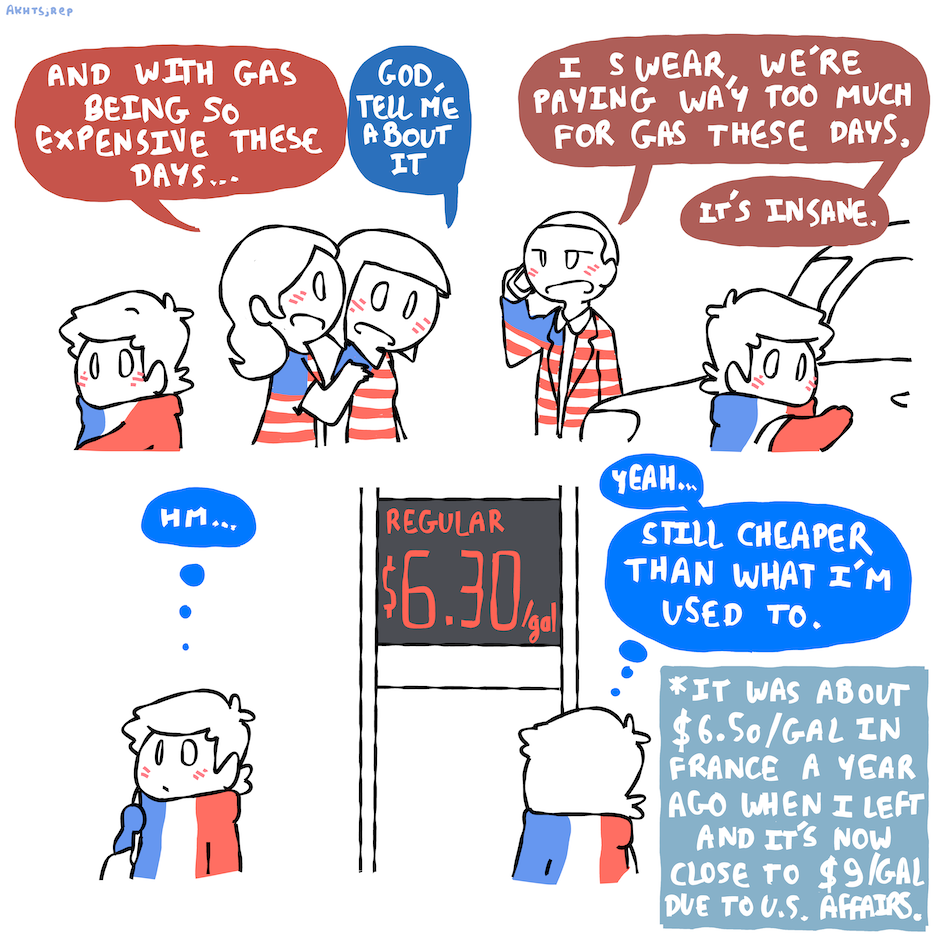 Mind you, that's in a France where the average salary is about two-thirds that of an average salary in the US, post-2008. And yeah, we have more trains, but that's not accounting for rural areas. Anyway. Housing prices here ARE insane, but hearing the gas prices thing always gives me pause with my still very French lens.