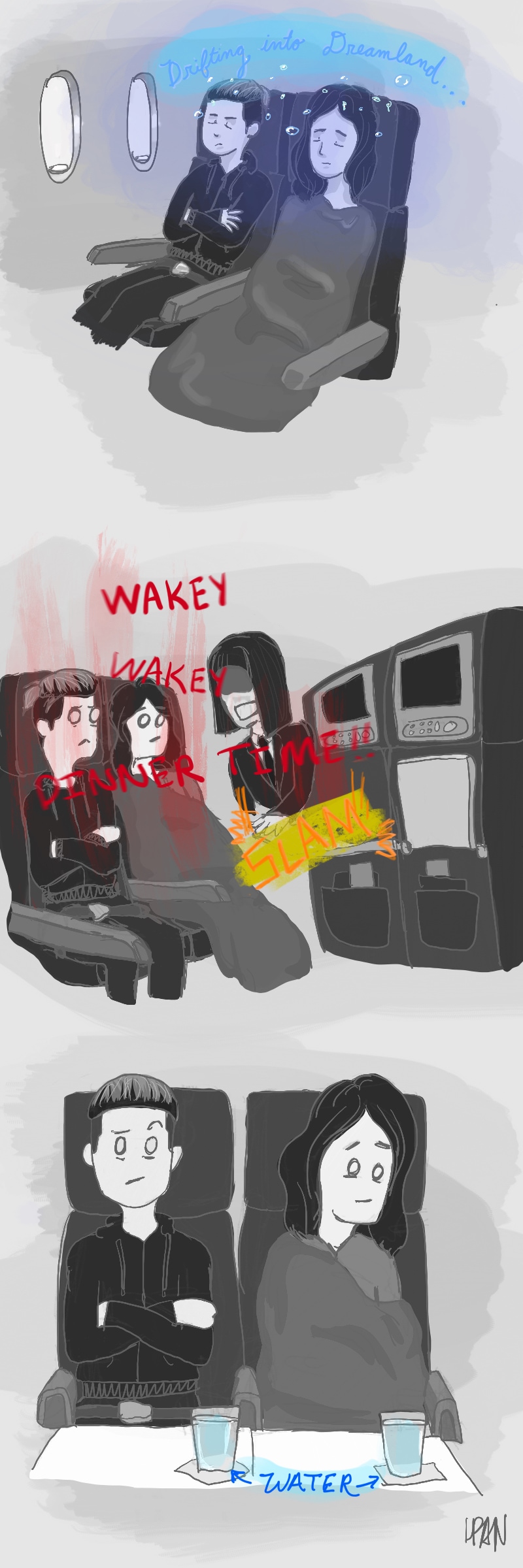 So this episode happened about 15 days ago on the flight to Hong Kong. I had a wild hope that I would be able to post a comic everyday, but that clearly didn't happen. For the first 10 days my Girl Scout troop and I would be out touristing and exploring until 10pm. Then I popped into China to see some friends there. Now that things have calmed down a bit and everyone but me is back in the States I'll hopefully be able to draw up a few more of our adventures.