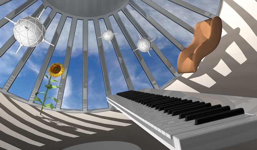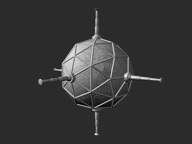 The space station from the previous sketch, made by Mom in Cinema 4D. The round floating things are robot-mines. Seems like a good place to be!