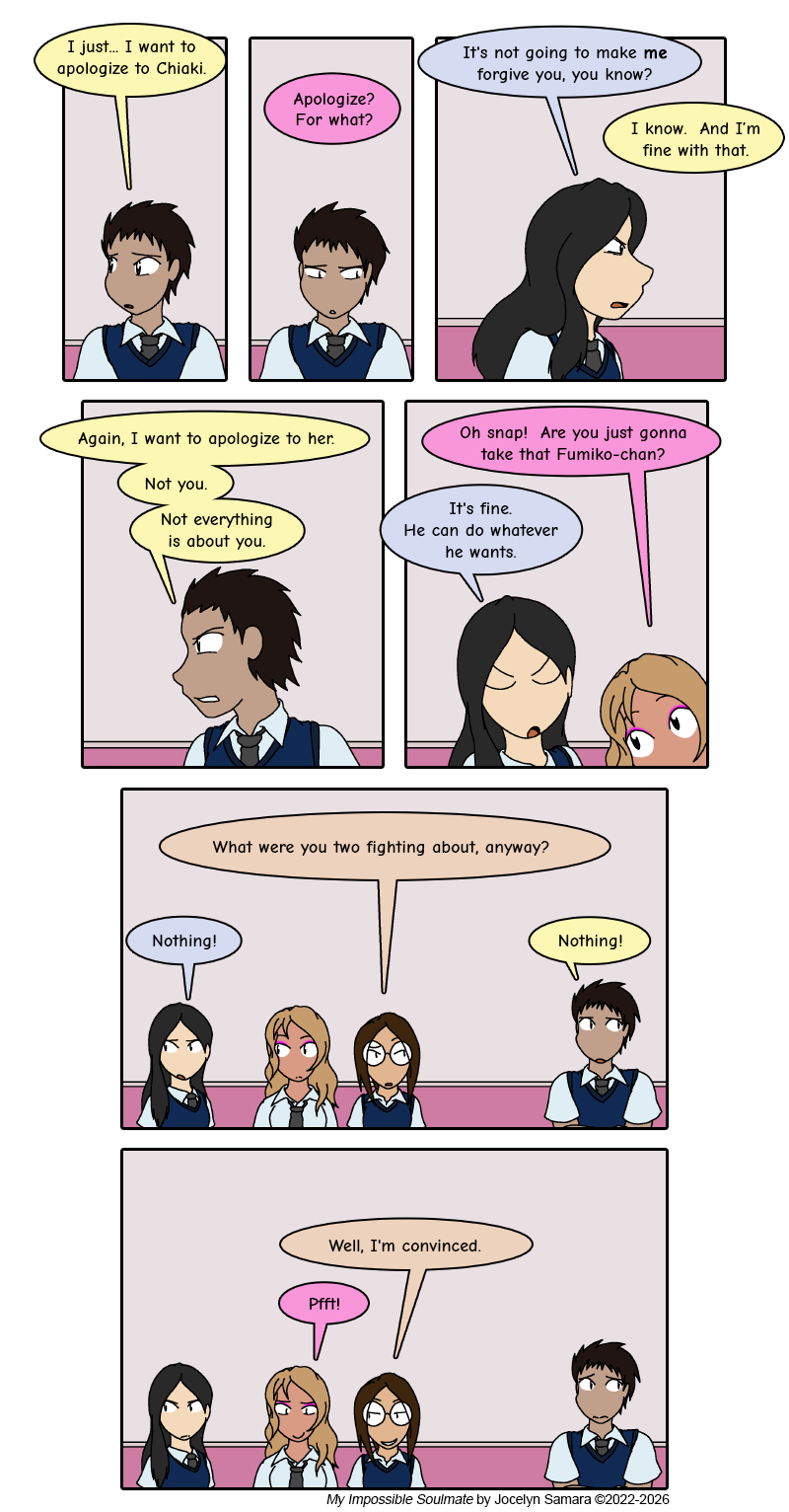 I don't have a lot to add here today. Fumiko and Kenta still don't want to discuss what they were fighting about in front of everyone, so there's not really much in the way of new information. I mostly kept this in for the punchline. This chapter could use a little levity. ^^;