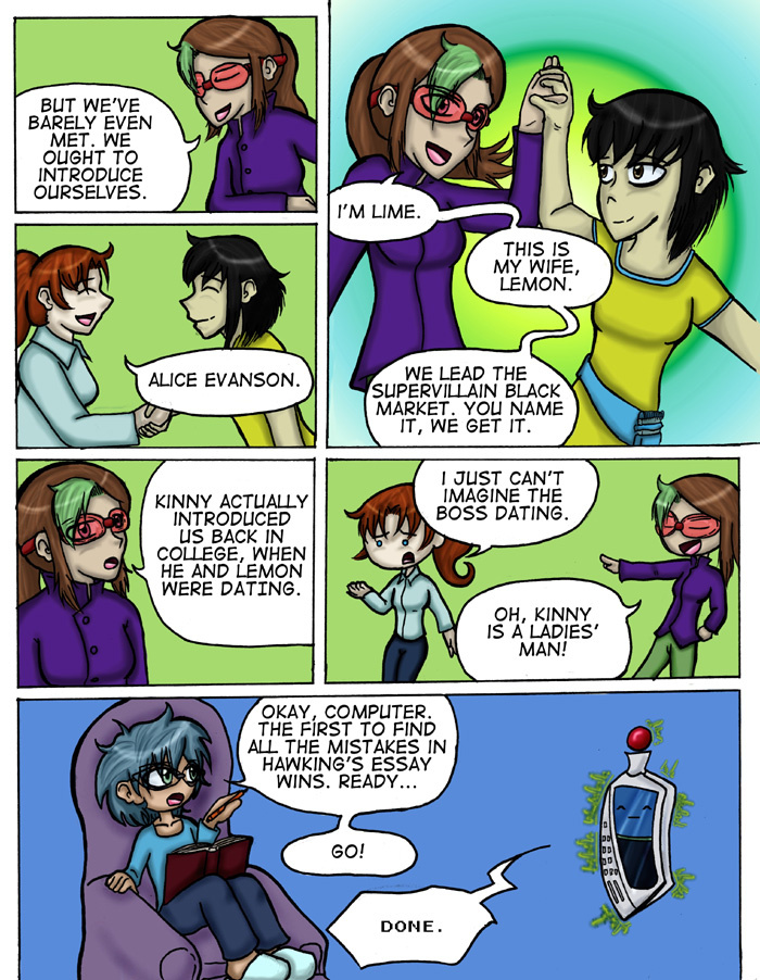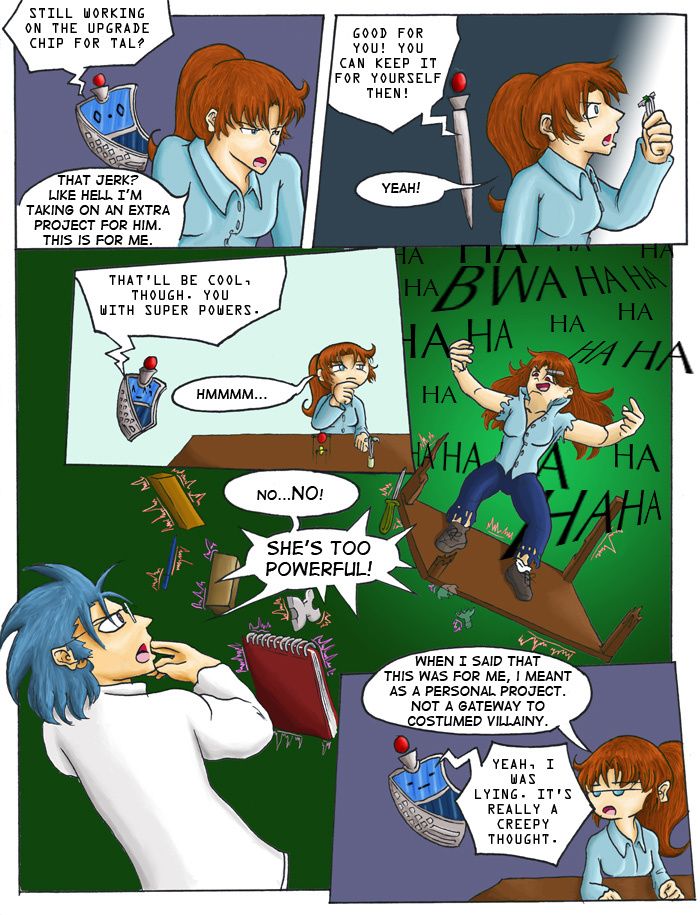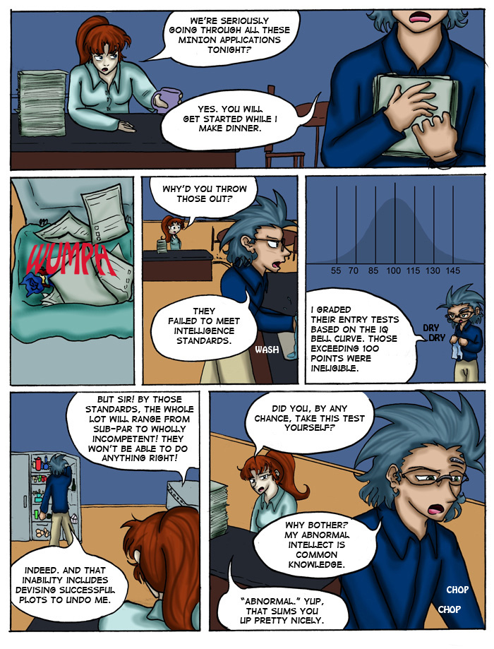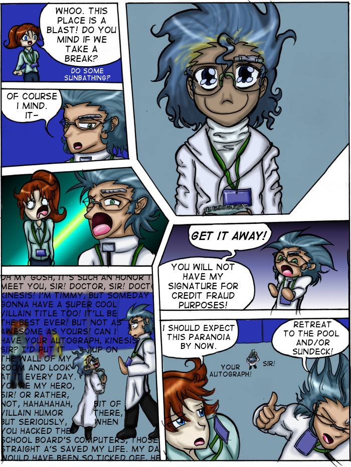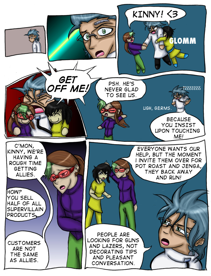 Evil Plan takes the superhero world and flips it, viewing things from the supervillain's perspective. The story follows Dr. Kinesis' journey on the road to world conquest. On the way, he'll have to deal with a troublesome AI, his unwilling friendship with crazy black-market dealers, and the possibility of romance with his second-in-command. And the superhero. Can't forget that guy.