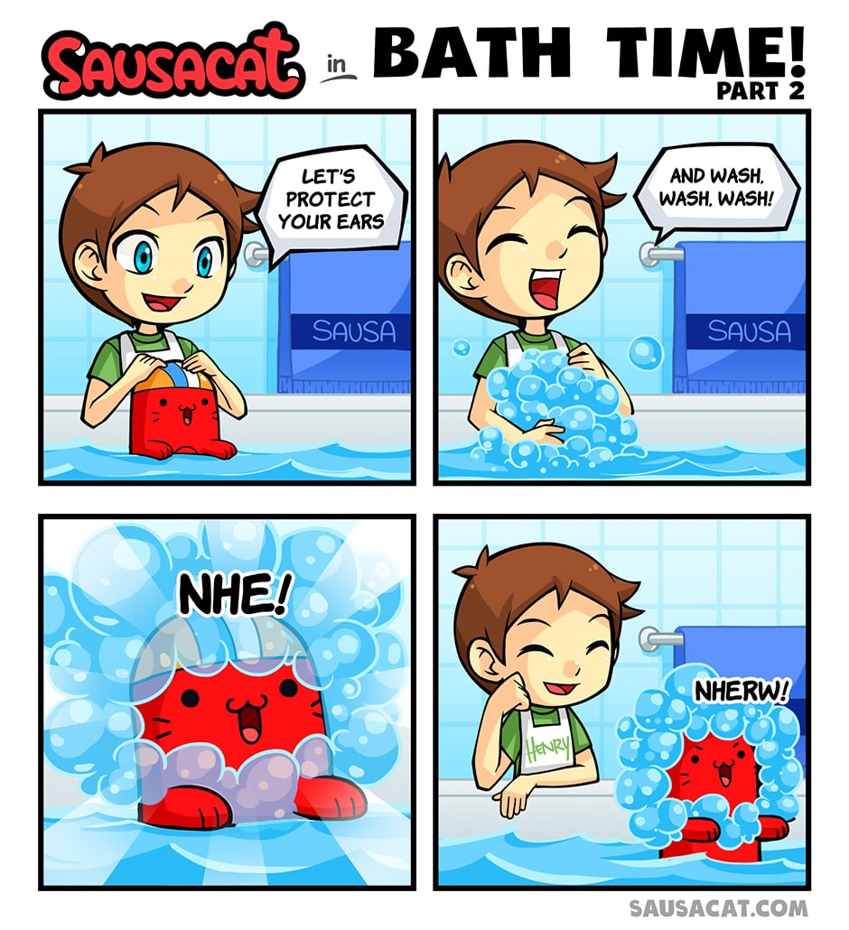 Your comics always brings a smile to my face. Lil sausacat loves his bubble bath time XD too bad sausacat isn't real I would own one in a heartbeat :'D