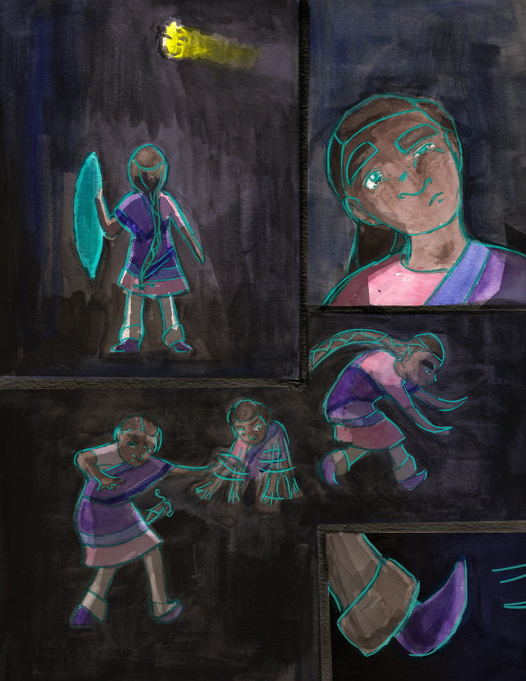 These next few pages had a new challenge where I inked them in a teal ink. The ink lost its luster when I colored in the gouache, so a lot of it had to be reinvigorated digitally.