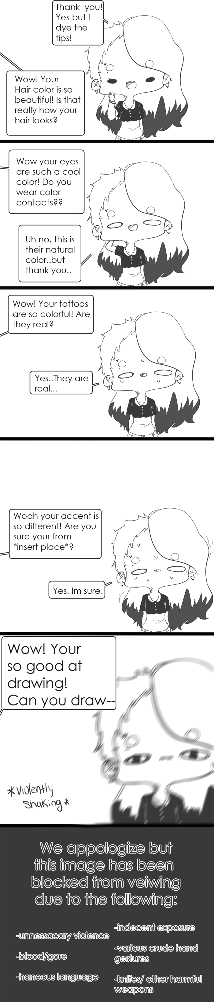 I was a bit nervous about uploading this at first because I didnt want people to think that I had a problem with being asked questions. Because trust me I would love to answer any and every question anyone has c: I just get these questions in real life literally all the time and sometimes I can get a bit frustrated and figured it would make a fun comic to draw.