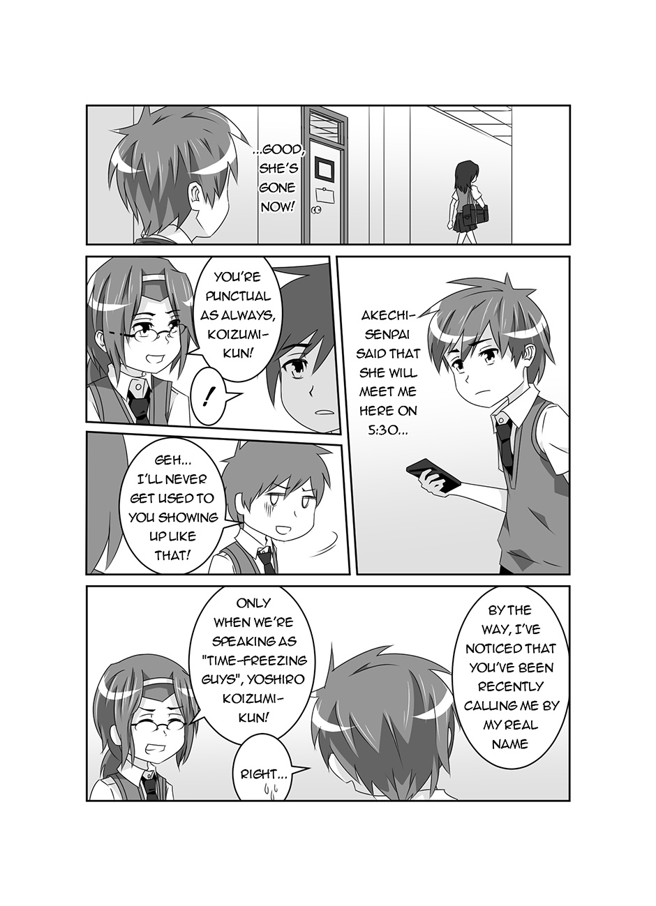 Pause is a story about a boy, Yoshiro Koizumi, who can freeze time whenever he wants to. When he suddenly meets a girl who is unaffected by his time-freezing powers, his peaceful high school life is thrown into chaos as she discovers his dark secrets which Yoshiro only shows when time is frozen.