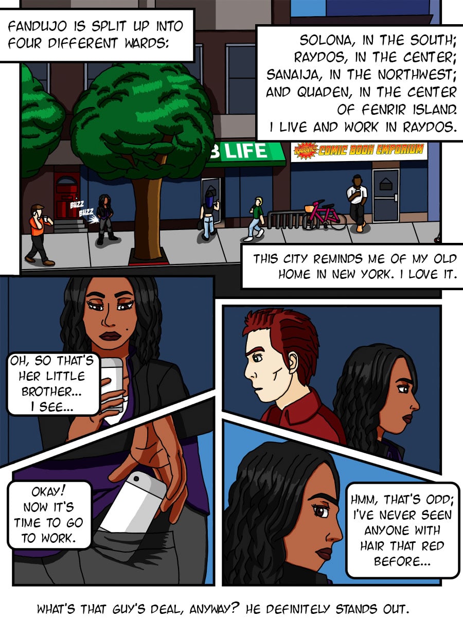As Blair (our protagonist here) states, Fandujo is divided into four districts, or wards: Solona, Raydos, Sanaija (pronounced SAN-ay-ya), and Quaden (pronounced KWAY-den). Emphasis on the first syllable in both cases. This will be expanded upon on my page to avoid a bigger wall of text.