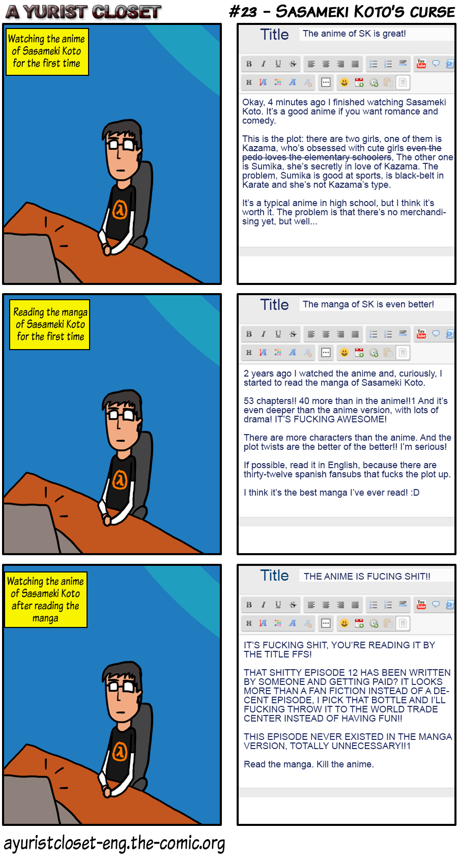 A comic parody about lesbians, videogames, lesbians, fads, lesbians, anime... and lesbians. If you like dark comedy, the Yuri genre, and want to lose your dignity, this is your webcomic. Don't forget to bring your over-sensitive friend and to do Virtue Signalling about cancer and poverty in Tumblr.