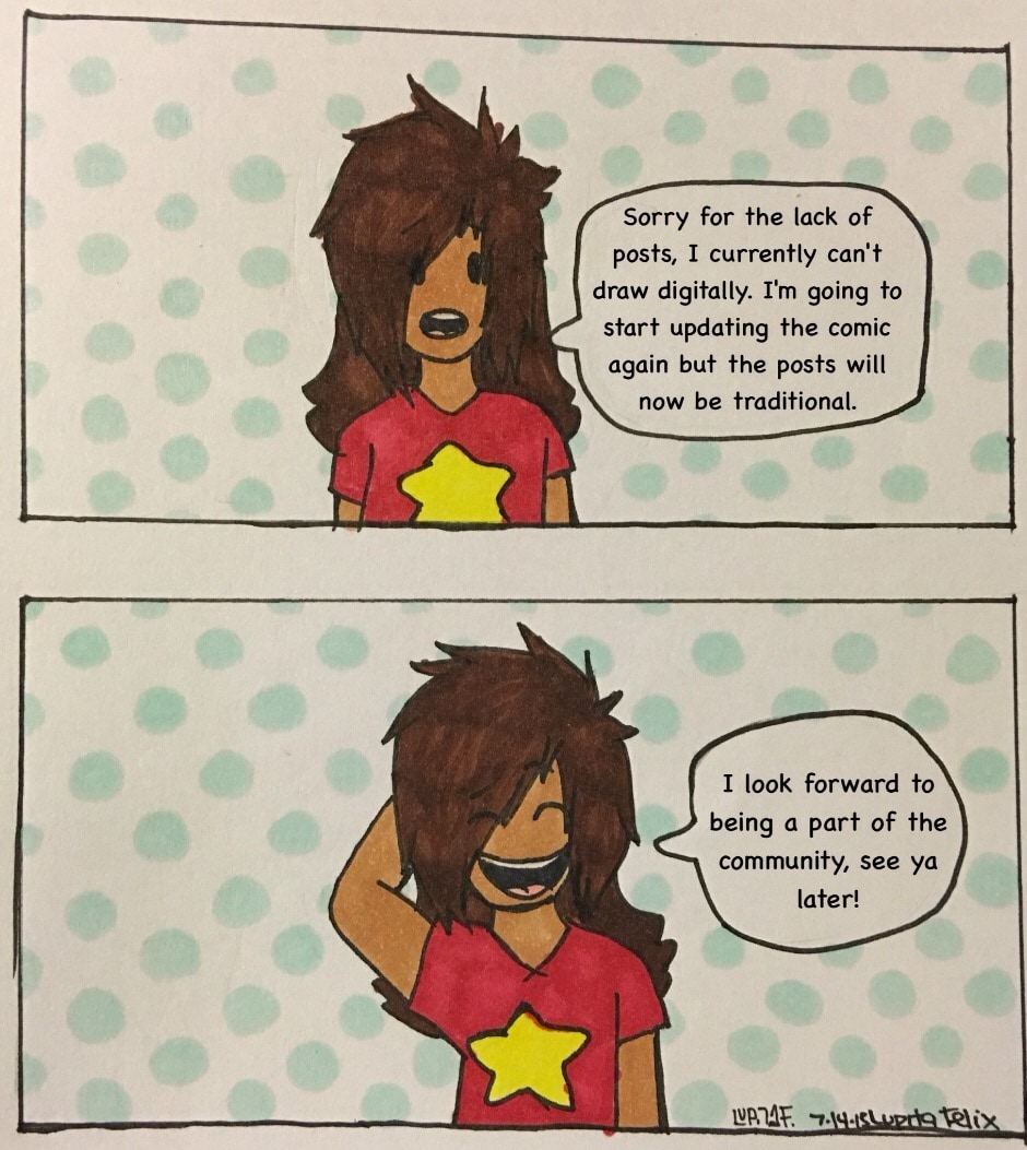 I'm back! I kinda broke my laptop so I wasn't able to update the series. I'm going to be updating but it'll be in the traditional style and have a bit of lower quality.