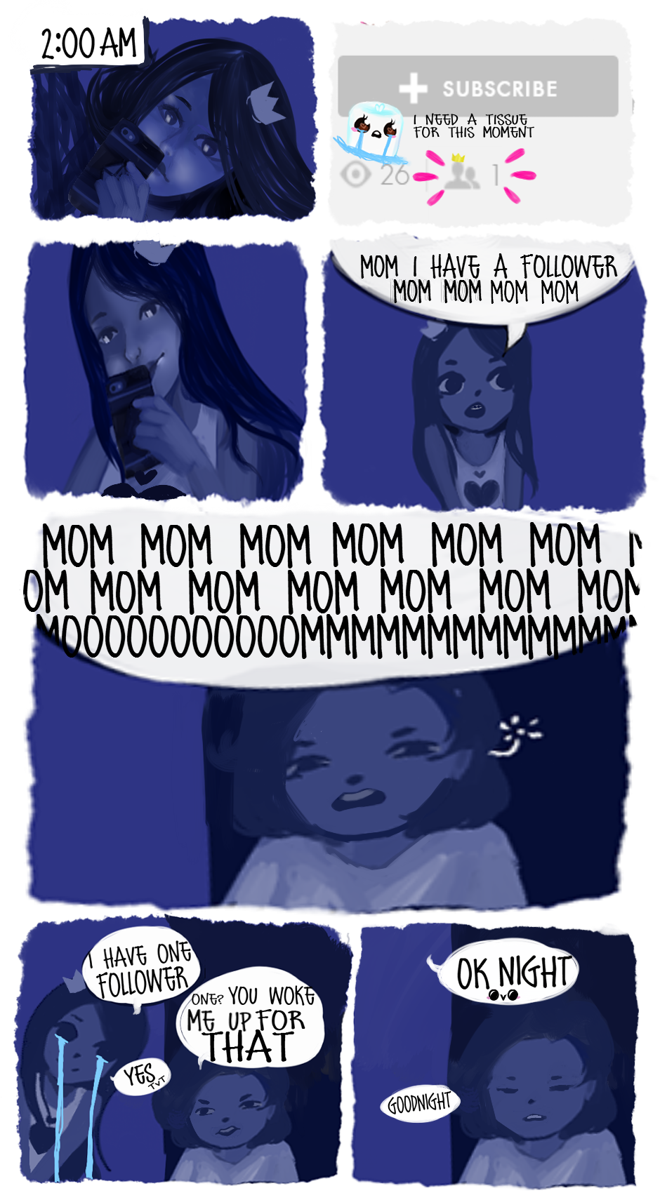 I also started reading it as nom nom XD Don't cry you deserve the subs! Also your poor mom I feel her needs of wanting sleep. my son has been on a kick of waking up super early and it don't help being pregnant and not getting decent sleep anymore. I'm sure your mum is proud of you though :'D congrats again on the subs