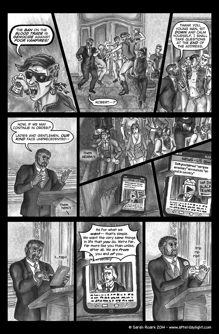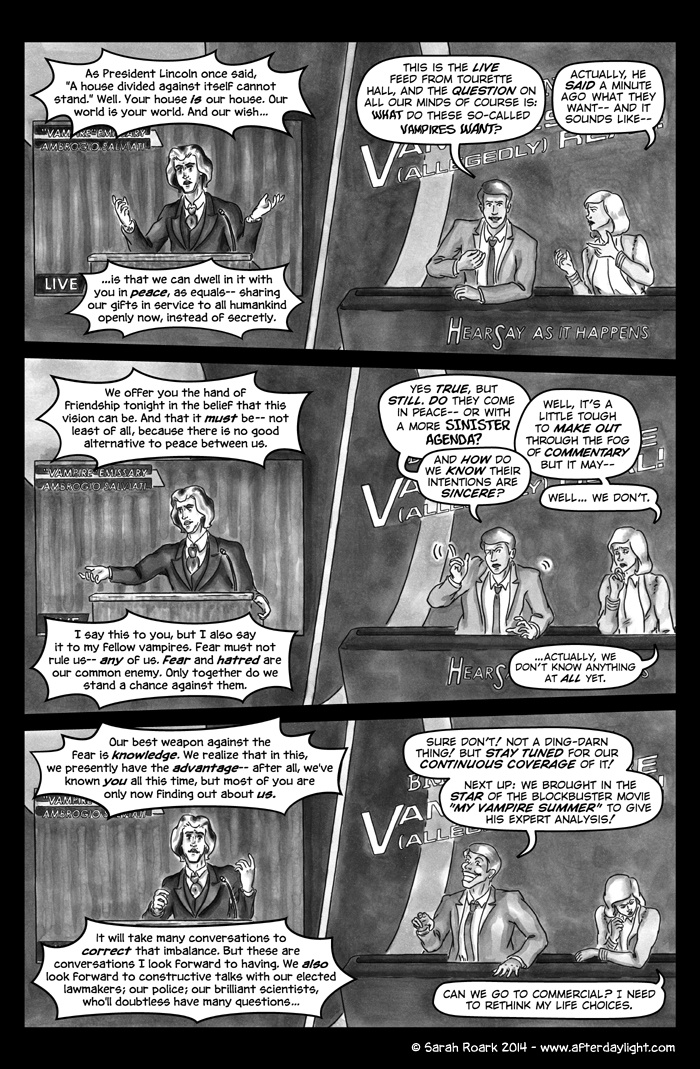 What's Daylight? That's what the vampires call it when humans find out about them en masse. (Which gives you some idea of their feelings on the subject.) And what happens when Daylight hits vampires? Well, chaos, politics and snark, for sure...a little romance...a little slice-of-unlife...and God knows what else. Read along and find out!