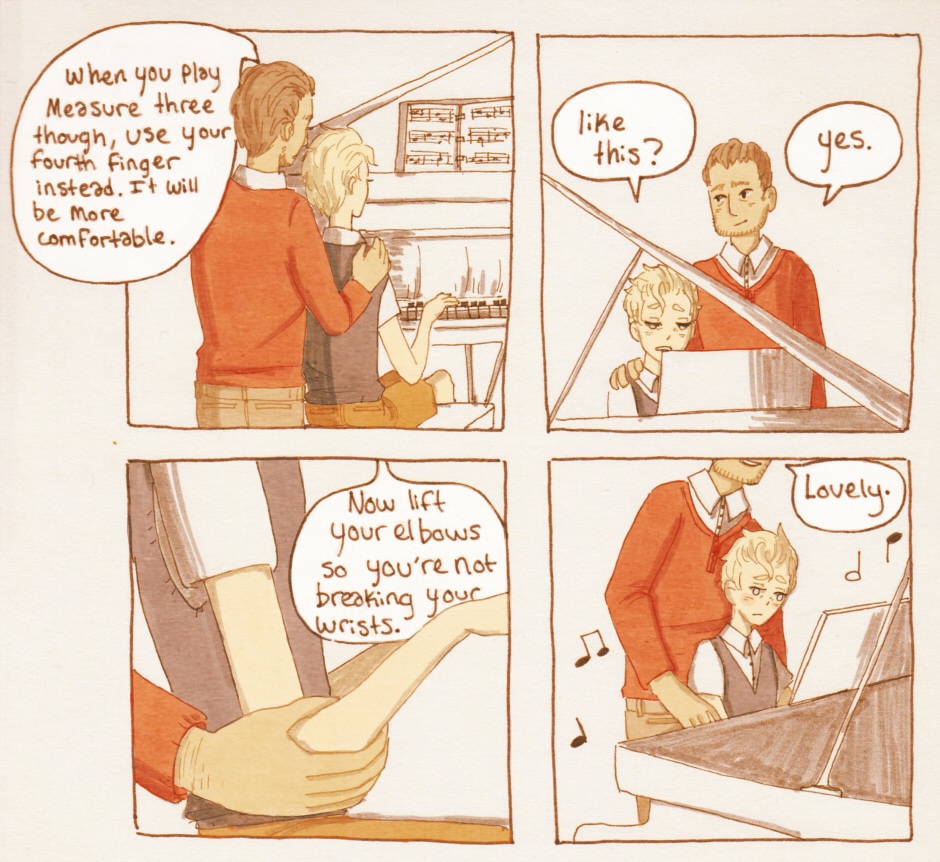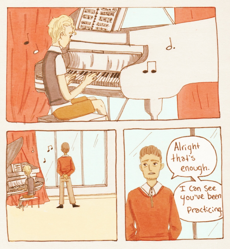You couldn't have "seen" that he'd been practicing. You weren't even looking at him while he was playing! You meant "hear", Mr. Mason. (And the poor kid looks SO bored. :c )