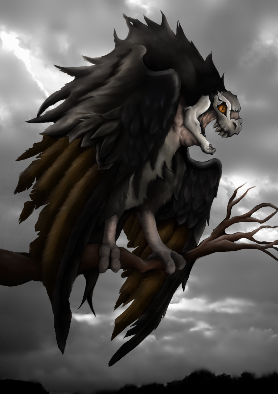 The Harpie is a scavenger angel that tends to be less of a treat wen alone since it relies on the strength of the flock; tough this doesn't make it non dangerous as its extremely aggressive toward anything and in some cases it's even known to attack its own kind and cannibalize it. It Has a plated face to defend its frail flesh and only weakness, since the rest of its body is covered by extremely resistant and durable feather. It lacks the ability of speech unlike its other angel counterparts. Some of the most eccentric and wealthy human tend to pay heavy dollar to get their hands on one of these since they make the best guard dogs against other angels and humans. It tends to be mostly active during the night. Unlike its male counter part the female has dull colors for better camouflage purpose. It also lacks a crest and has smaller canines .Its eyes tend to be of orange or yellow color with a vertical slits pupil wile the male ones tend to be red with a normal round pupil and on extremely rare cases blue. The female has an excellent night vision making them better hunters; It also tends to be more aggressive than its male counterpart. A female Harpie will never be hesitant to attack making them nearly impossible to tame.
