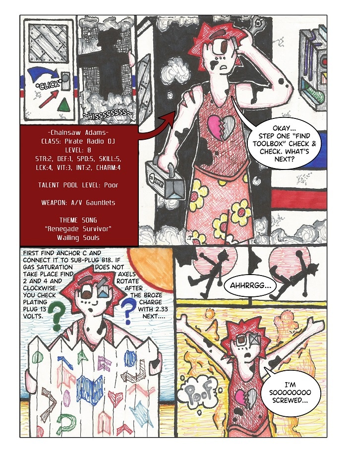 Chainsaw Adam's, a lone pirate radio dj travels a post apocalyptic wasteland broadcasting a message of rebellion. Calling to the abstract souls and the free spirits, he inspires those in hiding from the powers that be to rise up and fight back to create a new society built on the stuff that dreams are made of.
