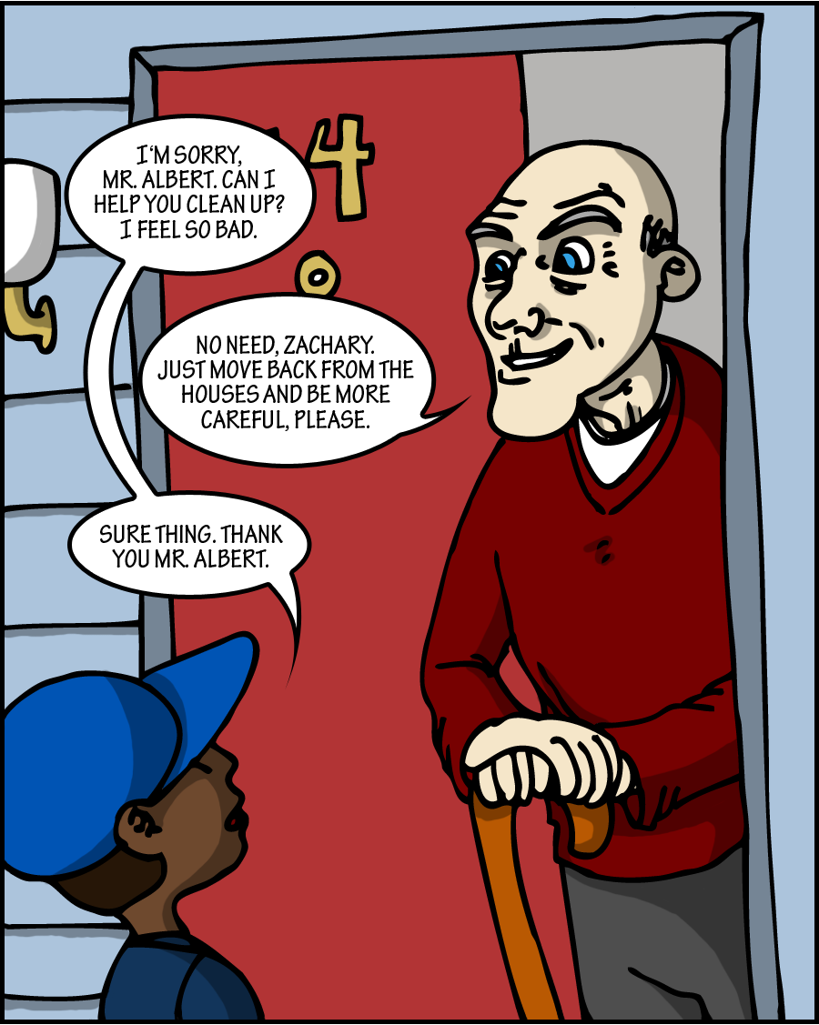 Who hasn’t broken something while playing baseball? Now, who has broken the same thing twice in one afternoon? Zack and Jason seem to have a certain mischief of their own. We are also introduced to Albert and Olivia, the (usually) sweet older couple in the neighborhood. We will see them from time to time, but they are not really a part of the major cast. Let us know who you would like to see more of in upcoming issues and we can fit them in. As always, thank you for reading!