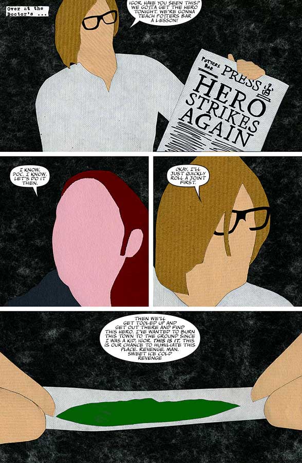 “Nothing-Men” is a Surrealist super-hero satire that takes place in the small sleepy Hertfordshire town of Potters Bar.