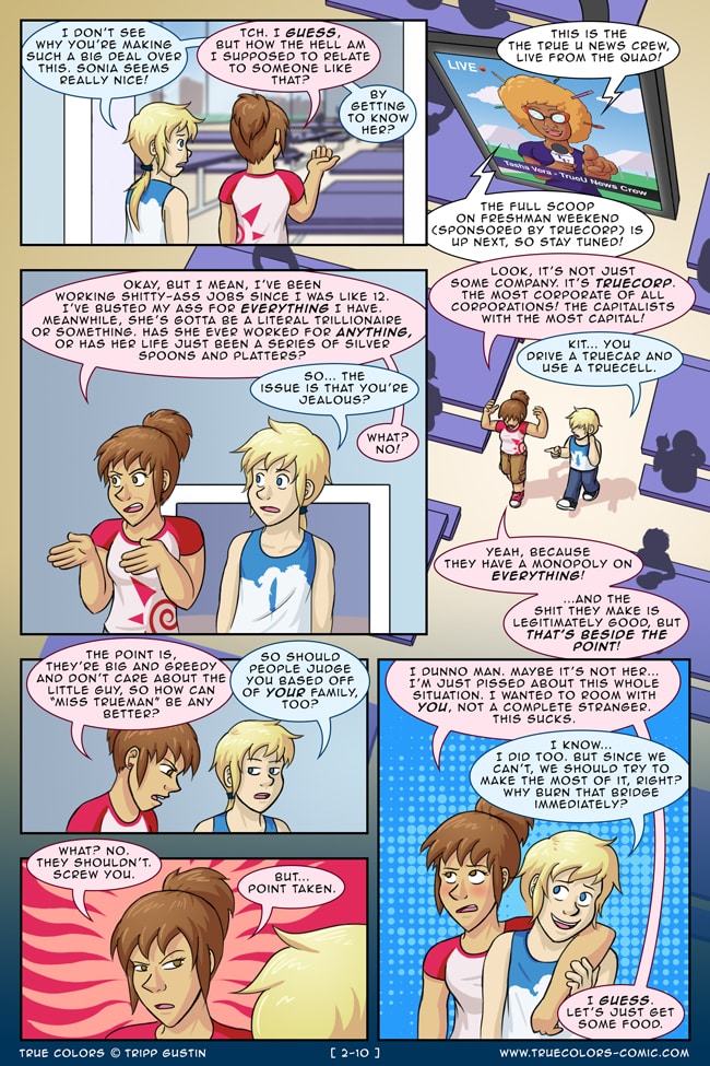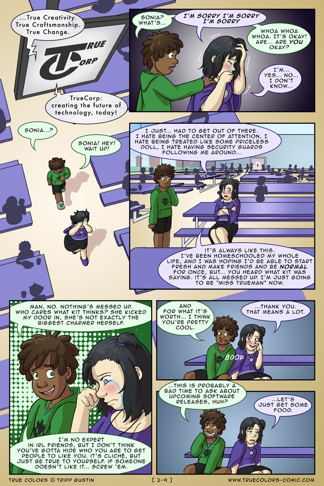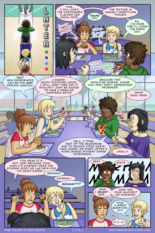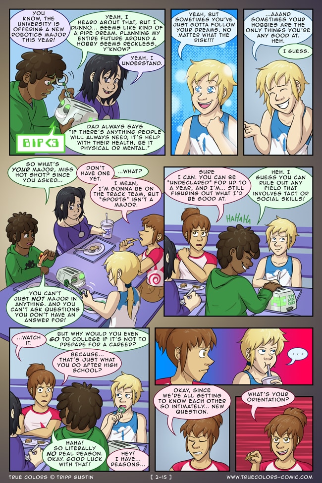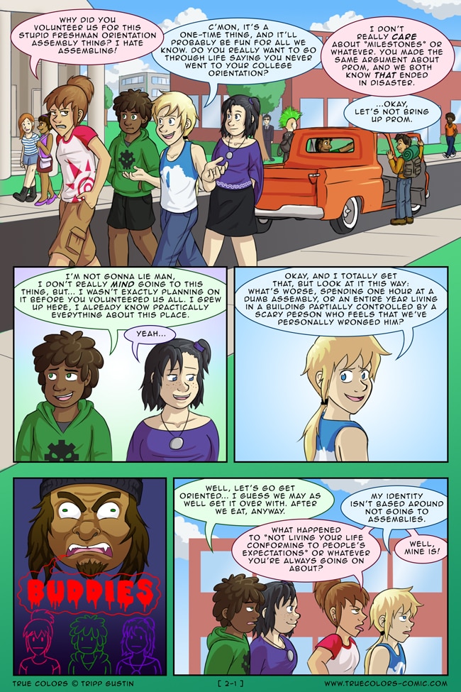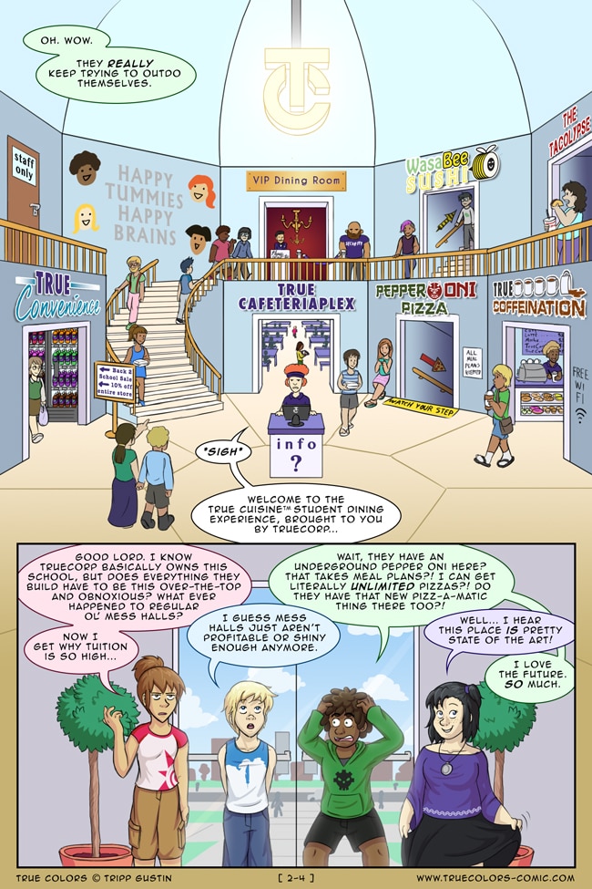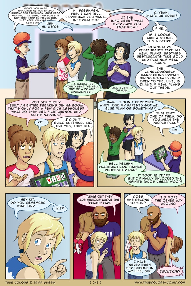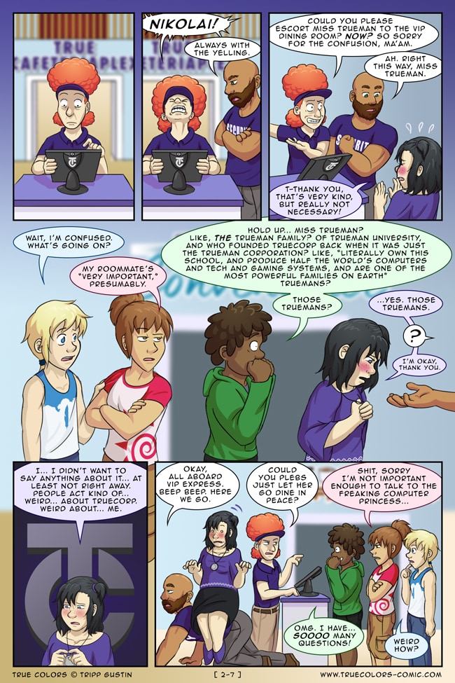 True Colors is a comedy, drama, and coming of age story webcomic about four kids on their very first day at Trueman University... a place where the friendships are fresh, the bridges are flammable, the parent corporations are ominous, the resident advisors are too much, and being true to yourself might not be all that it's cracked up to be.