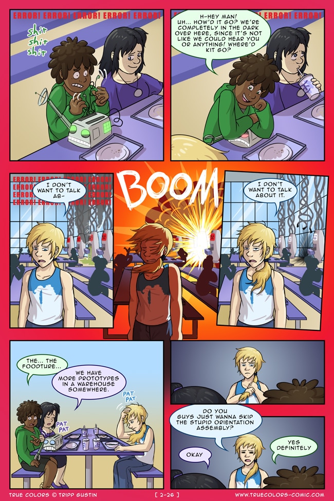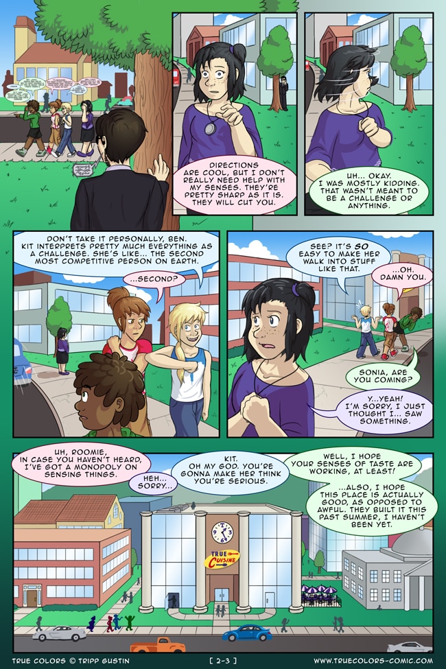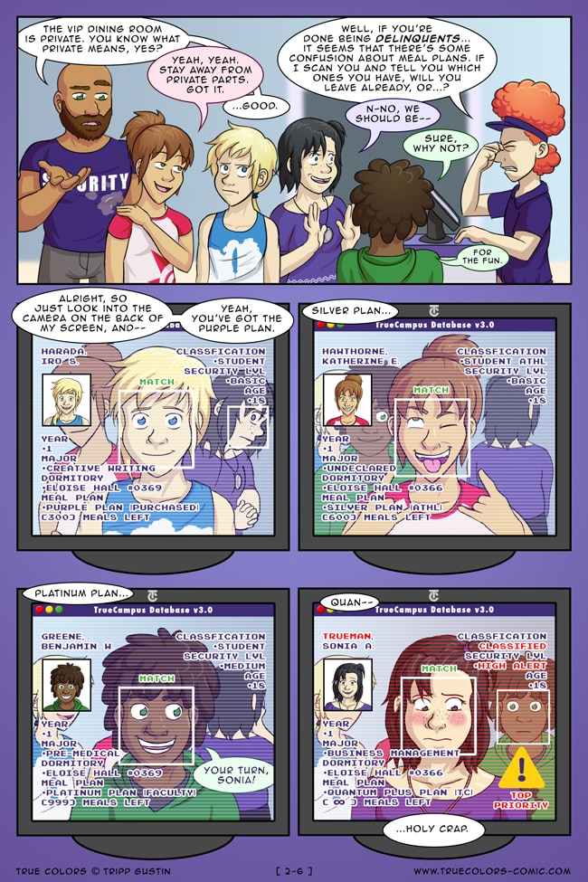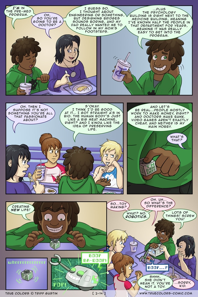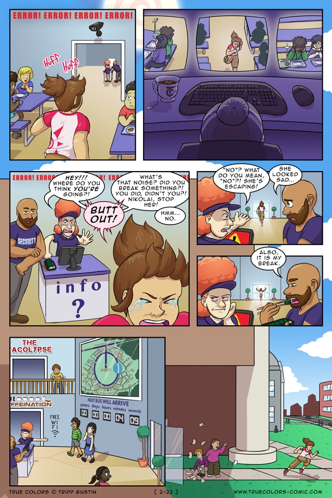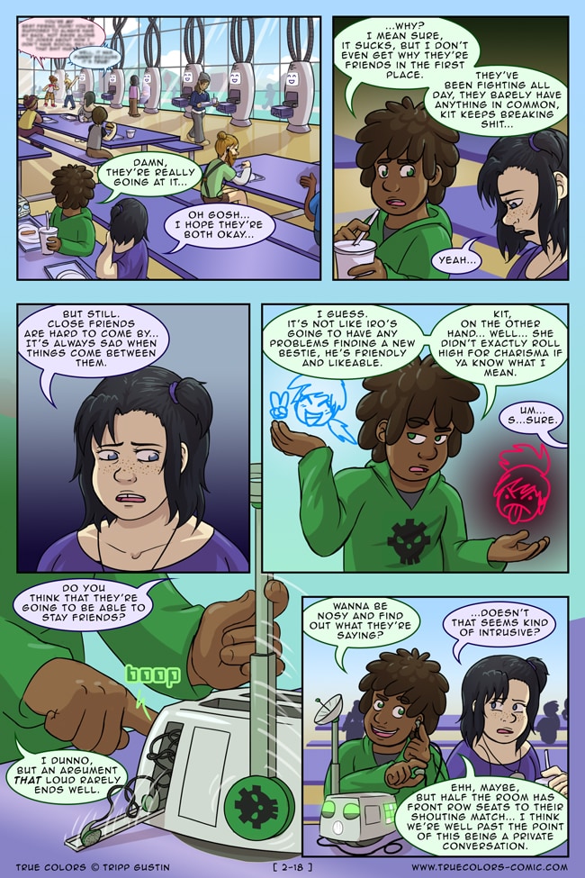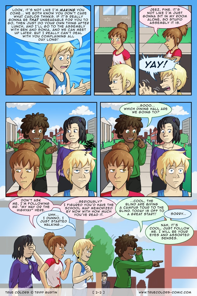 True Colors is a comedy, drama, and coming of age story webcomic about four kids on their very first day at Trueman University... a place where the friendships are fresh, the bridges are flammable, the parent corporations are ominous, the resident advisors are too much, and being true to yourself might not be all that it's cracked up to be.