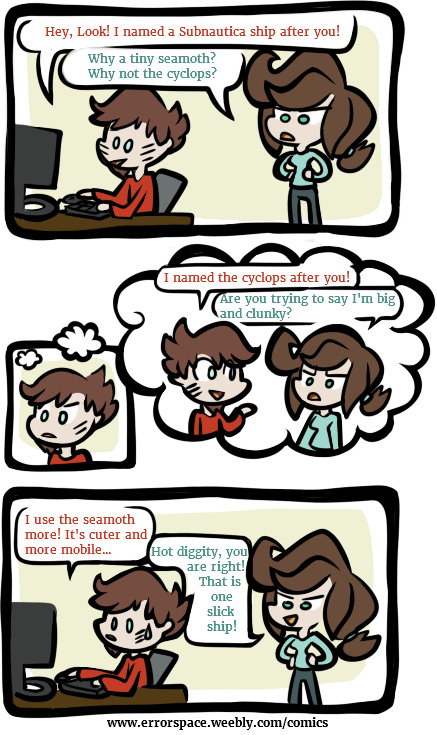 Nick's been playing plenty of Subnautica, and he showed me the seamoth he named after me. I thought it was cute... until I saw the big majestic ship he built after that. I wondered why he didn't name such sea beauty after me instead of the teeny mothship, but after some thought, the seamoth is a lot cuter.