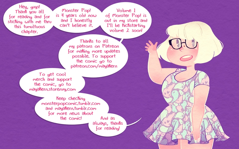Chapter 4 is over! Here’s some closing words! I’ll be taking a break from making new strips for a little while to prep for the second Kickstarter and to go to my last two conventions (Otakon and San Japan) and then move! All at the same time! (Help I’m gonna die)