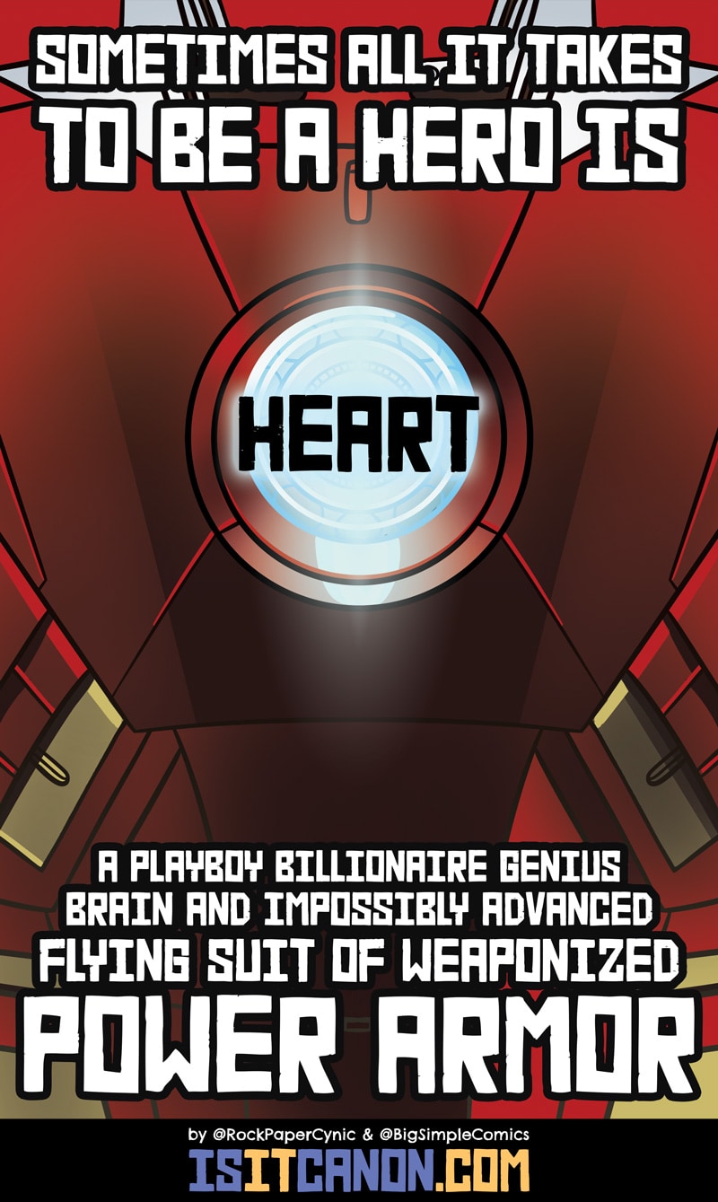 Aaron really enjoyed working on the "only thing you need to be a hero" comic and decided to draw this up as a poster! http://rockpapercynic.storenvy.com/products/17606441-demotivational-iron-man-poster Also, we're appearing at Boston Comic Con this weekend at table D281. If you're in the neighborhood, come by and say hello!