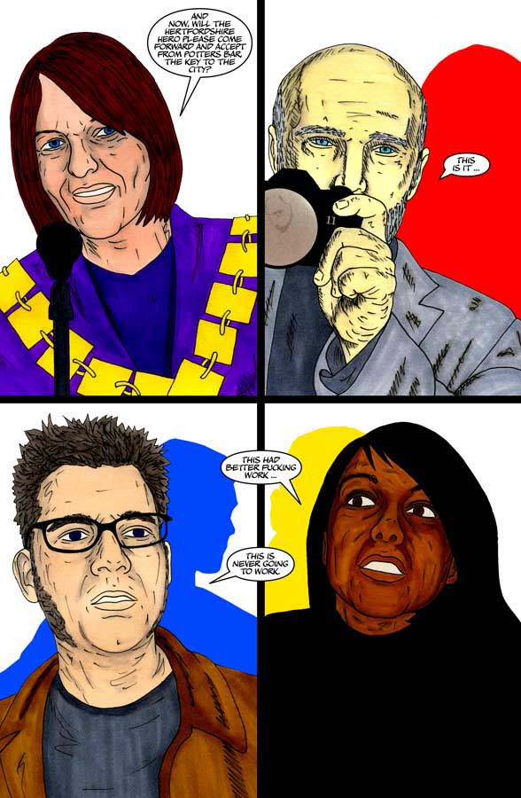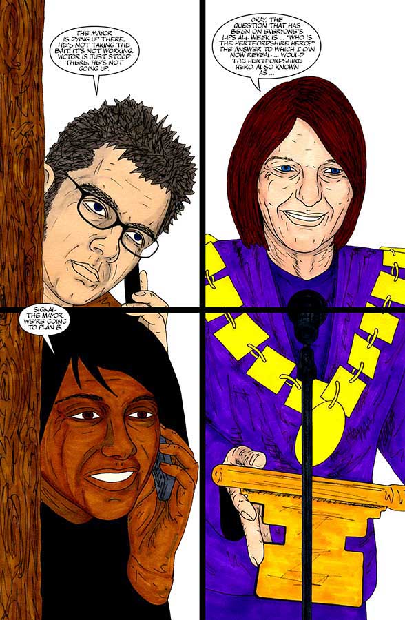 The comic follows many of the town's absurd residents whose boring, mundane and unexciting lives are suddenly turned upside-down with the arrival of a mysterious nocturnal vigilante: “The Hertfordshire Hero”.