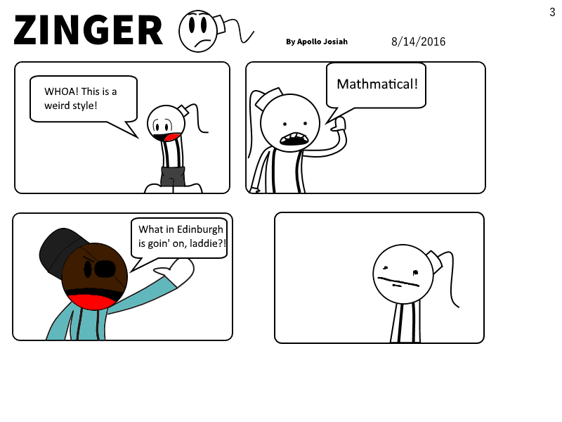 Zinger is a chipper, yet cowardly bomb. He is always thrown into the worst predicaments. But with his friends, his little brother Zylo, and a bit of luck, he'll at least have a chance of survival. So grab your suspenders, because it's time for the Zinger of a comic!