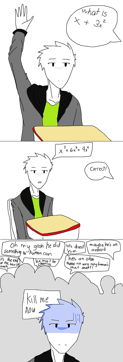 everytime when im the only one who gets the lesson as in understands everyone is like that also because i suck at the subject of my own native language and history also i forgot to put a parenthesis and power by 2 so its supposed to be "what is (x+3x)^2