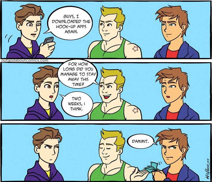 Out & About is a comics series created by illustrator Kris Barz that tells the story of Kevin and his friends going through life and its challenges. All the characters are part of the LGBTQIA community. The stories are about friendships, relationships, work, family, sexism, prejudice and the strips touch those issues with irony, comedy and a little bit of sarcasm.
