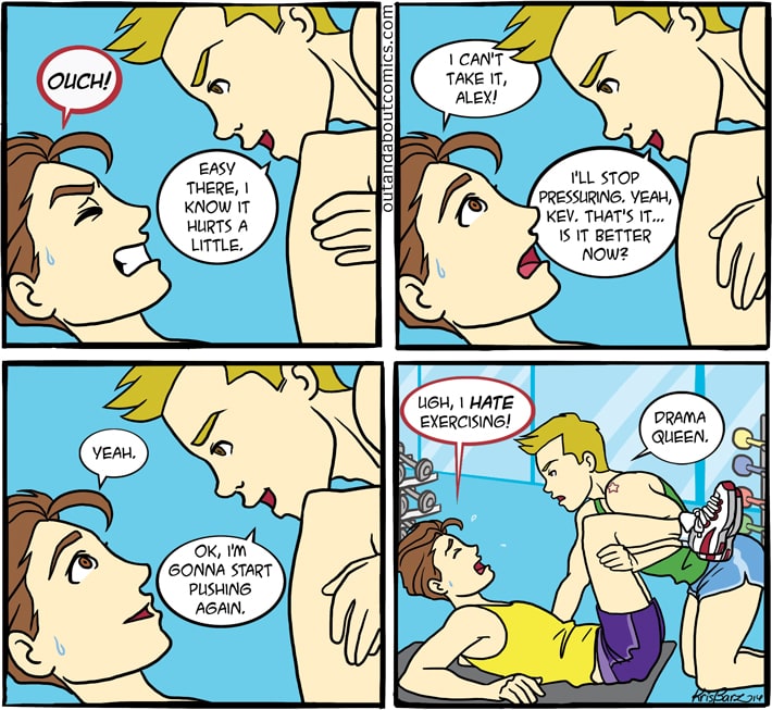 Out & About is a comics series created by illustrator Kris Barz that tells the story of Kevin and his friends going through life and its challenges. All the characters are part of the LGBTQIA community. The stories are about friendships, relationships, work, family, sexism, prejudice and the strips touch those issues with irony, comedy and a little bit of sarcasm.