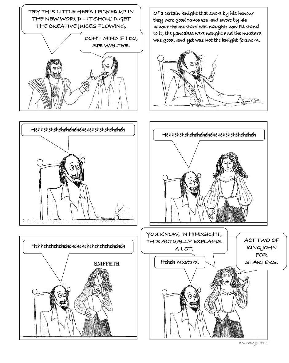 Bit of an odd one, this. It was originally drawn in reaction to this article. http://www.openculture.com/2015/08/pipes-with-cannabis-traces-found-in-shakespeares-garden.html