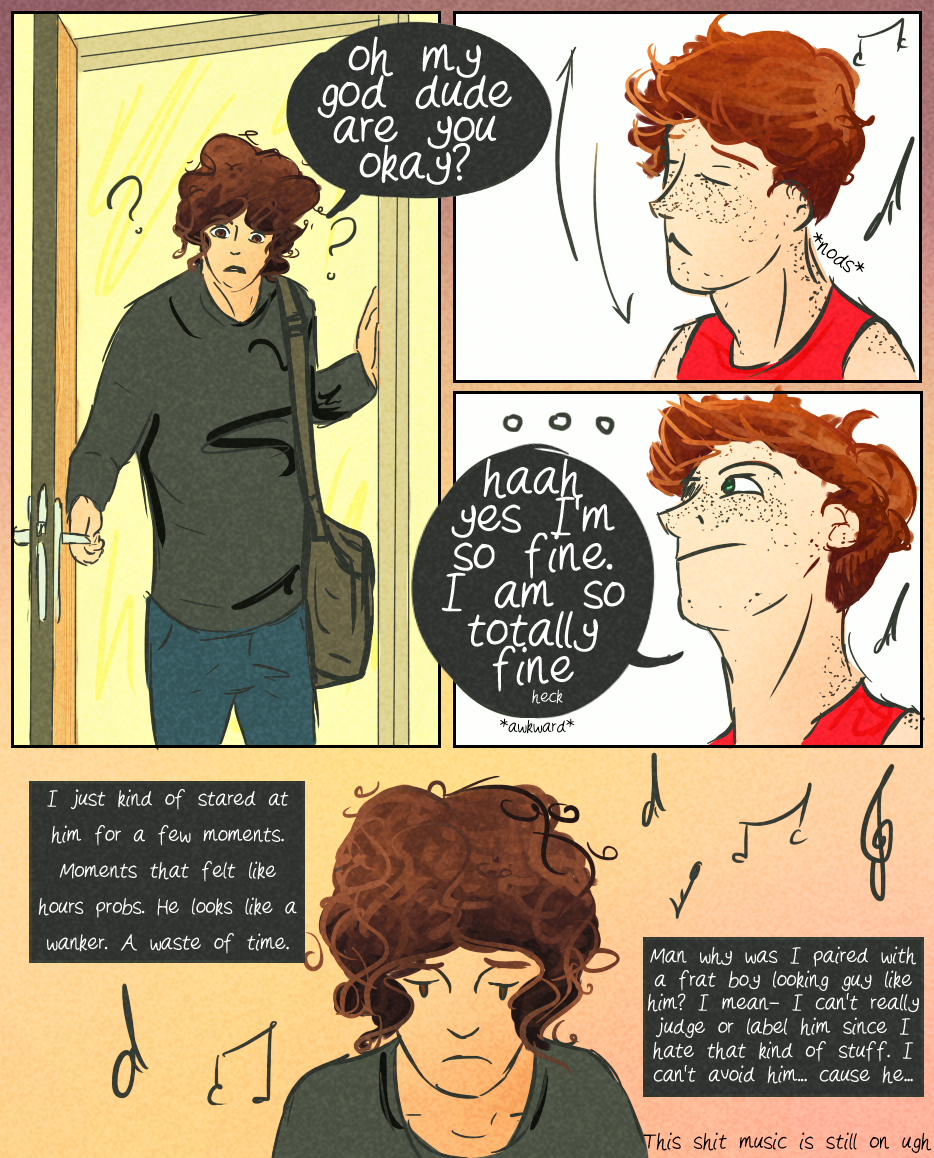 Here's actual page since the last one didn't really count. I'm so tired. Uploading comics at 3am. I shoul dbe sleeping lol kill me pls I have a lot of fun with Ale's hair and Phils freckles.