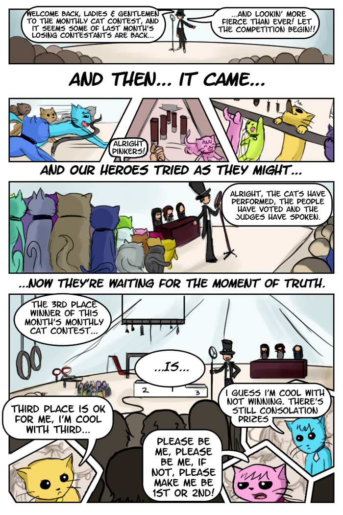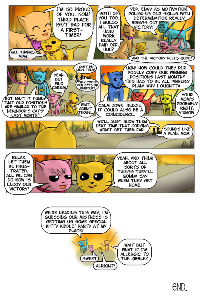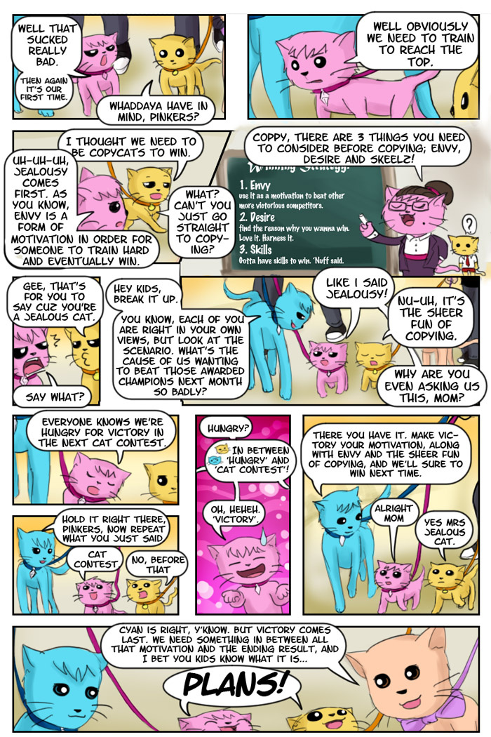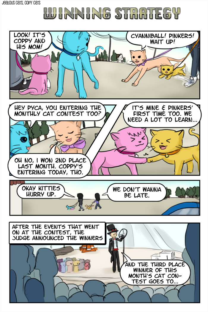 How to outdo the winners: Step 1 - ask some tips and how they won Step 2 - do their thing Step 3 - try to outdo their thing by taking everything a step further Step 4 - act like them when you win http://jealouscats-copycats.smackjeeves.com/comics/1458178/winning-strategy-pg1/