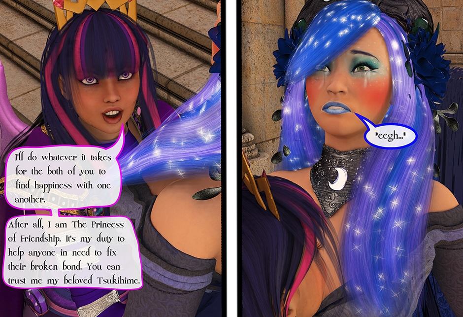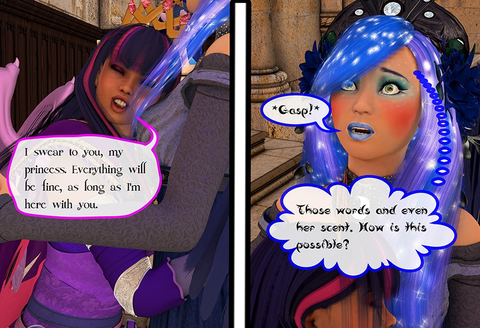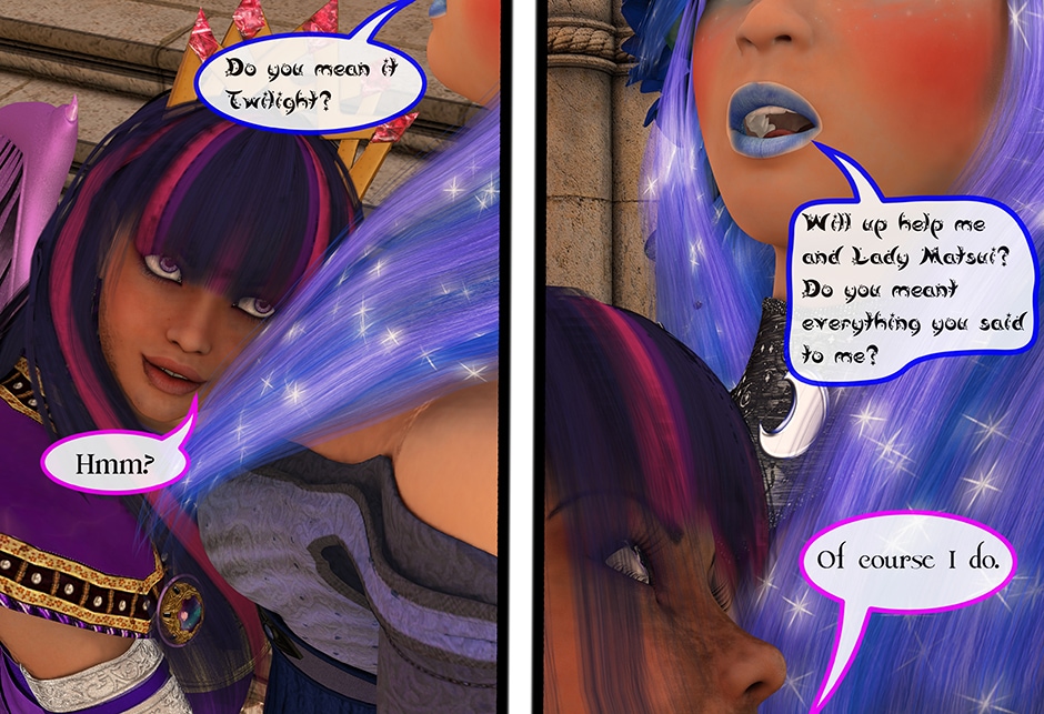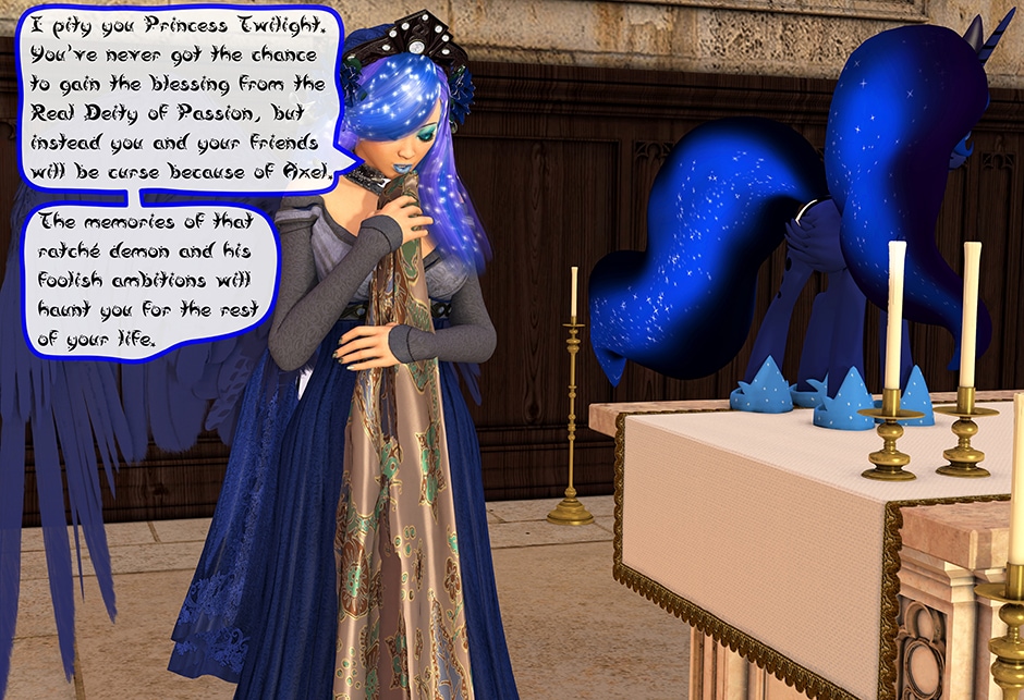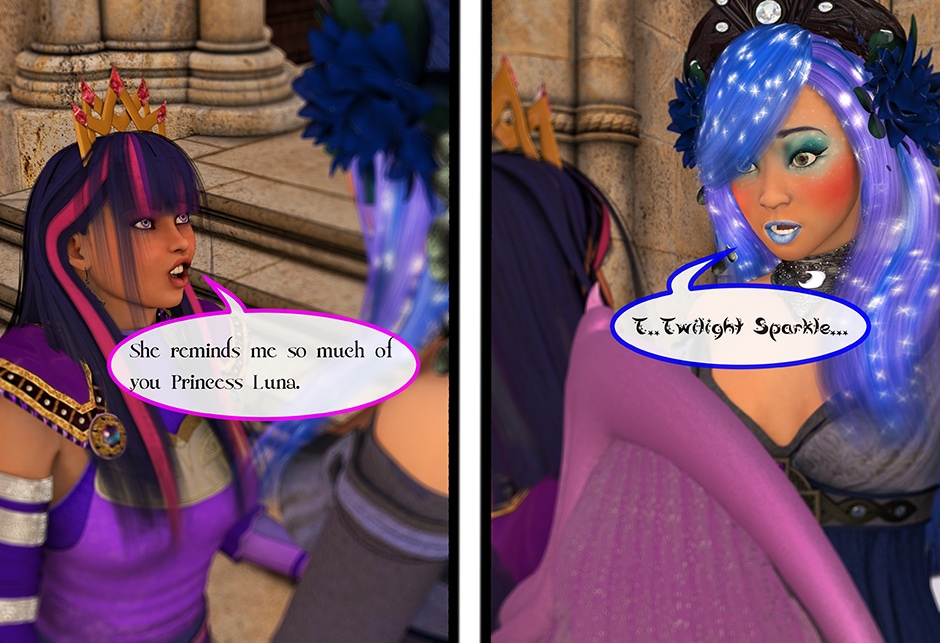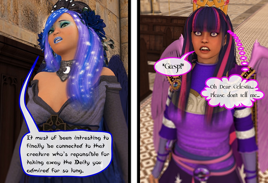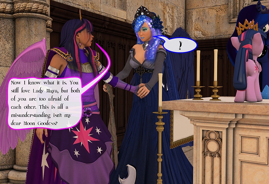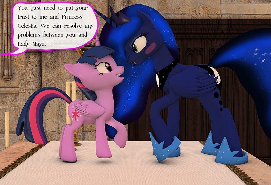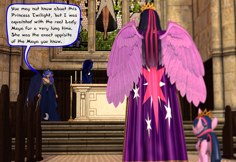 The Princess of Friendship, Twilight Sparkle confronts the Moon Goddess of Equestria in Lady Maya's behave.
