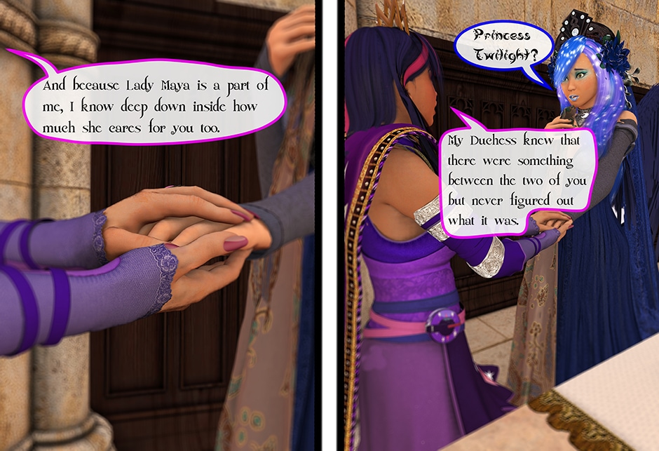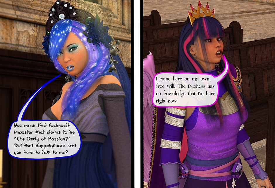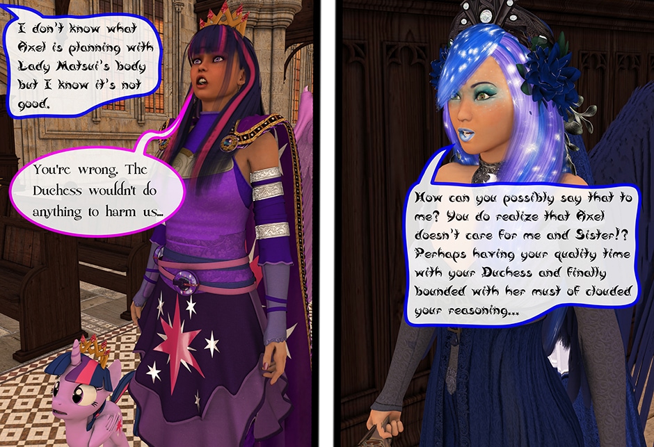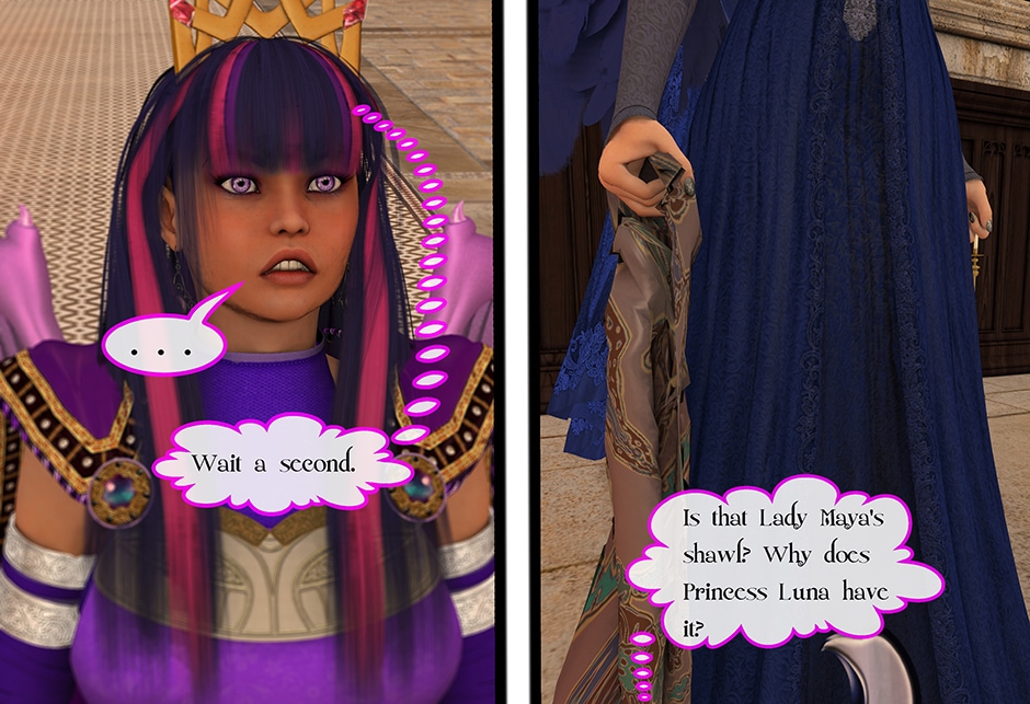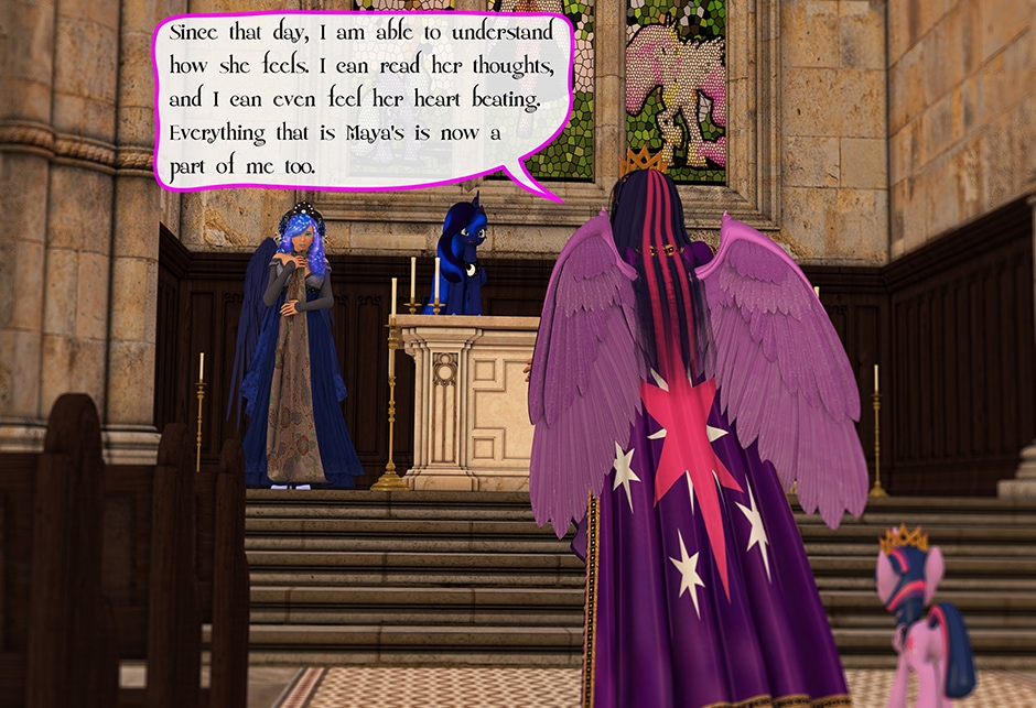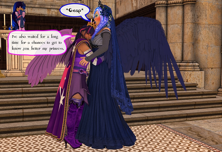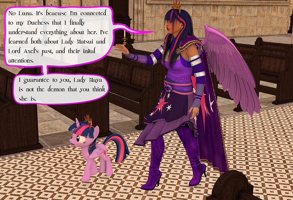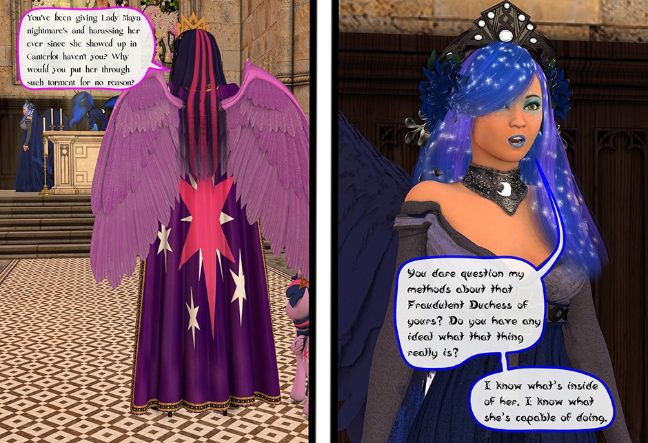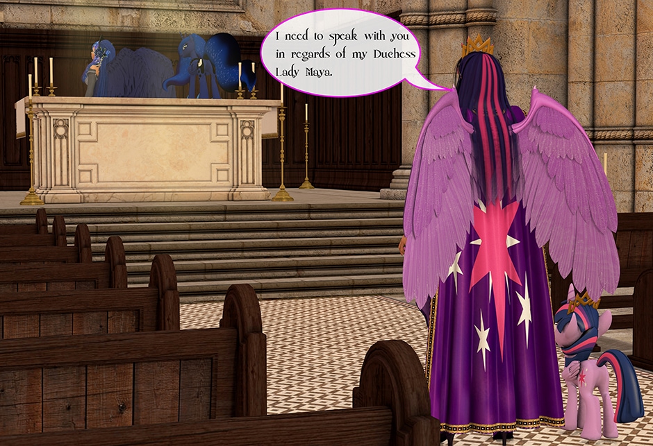 The Princess of Friendship, Twilight Sparkle confronts the Moon Goddess of Equestria in Lady Maya's behave.