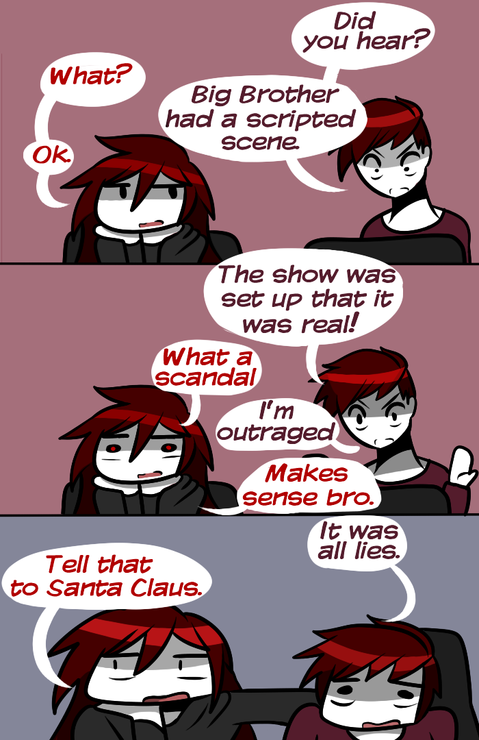 (If you don't understand, this British TV show Big Brother was exposed with a scripted scene except it's supposedly reality TV. It's trending on YTube)