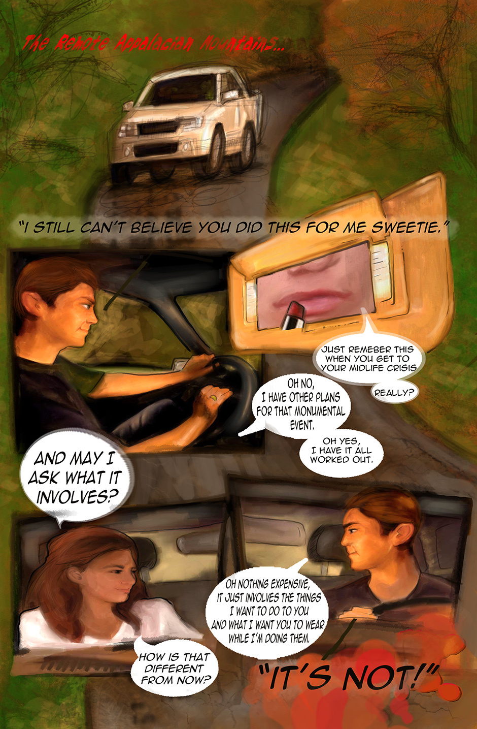 It's nice to see non fantasy work, a little critique, in the diner when they're about to kiss the wording gets a little "squished", I'd try to steer away from that, with so many web comics in the world, if people have to squint or decipher the flow they might give up! You want every edge you can get with your readers!
