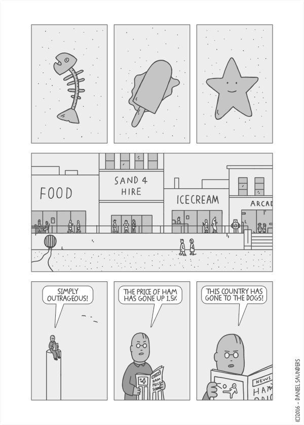 "It’s a typical day at the seaside. People are buying ice cream, having fun, complaining about the price of ham, etc. Meanwhile, one girl is anxiously looking out across the water. She is waiting for someone…"