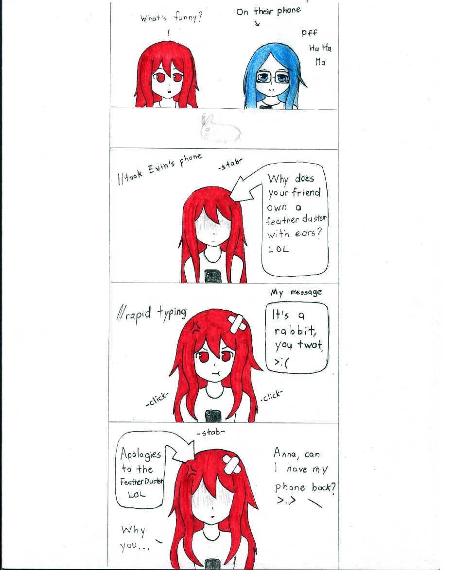 Evin sent a picture of my rabbit, Pocky to their friend. This happened xD he's not a feather duster orz. Sorry I haven't been posting, I haven't had any motivation to draw comics since Pocky passed away. This is a comic tribute to him. R.I.P Pocky.
