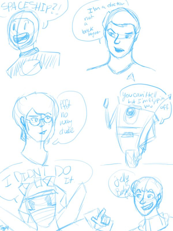 sorry i've been lazy and kind of dead.. Have some sketches of Benny, Bones, Me, Claptrap, Wheeljack and the Fourth Doctor I do not own any of the characters except for myself