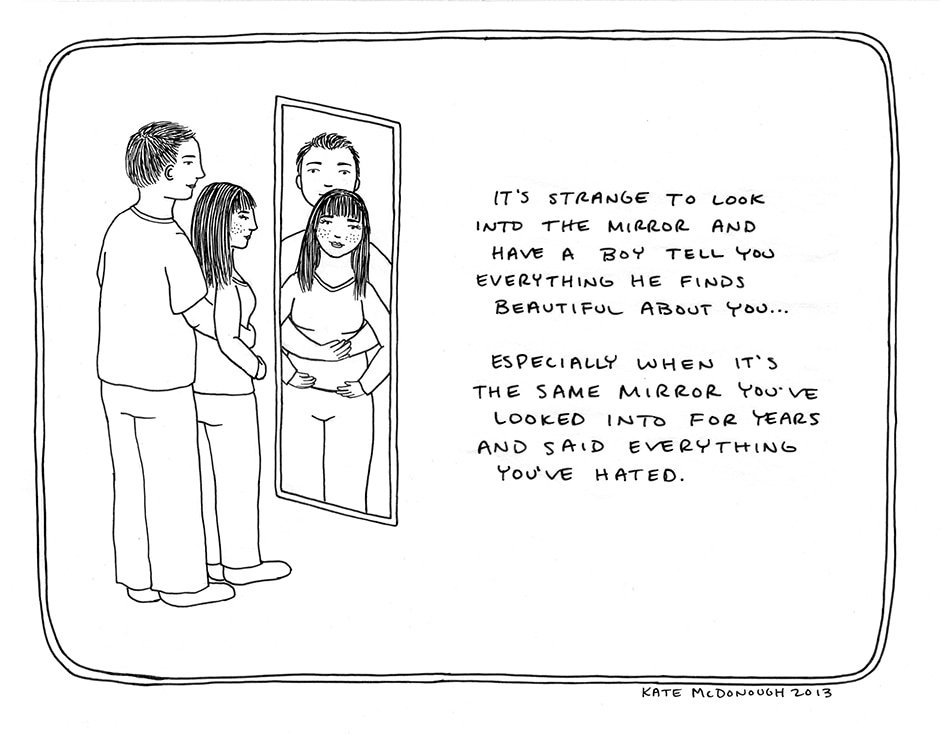 I made this comic when I first started dating my now-fiance. He was so sweet and kind, even though I often felt self-conscious. It helped me learn to love myself the same way he loves me.