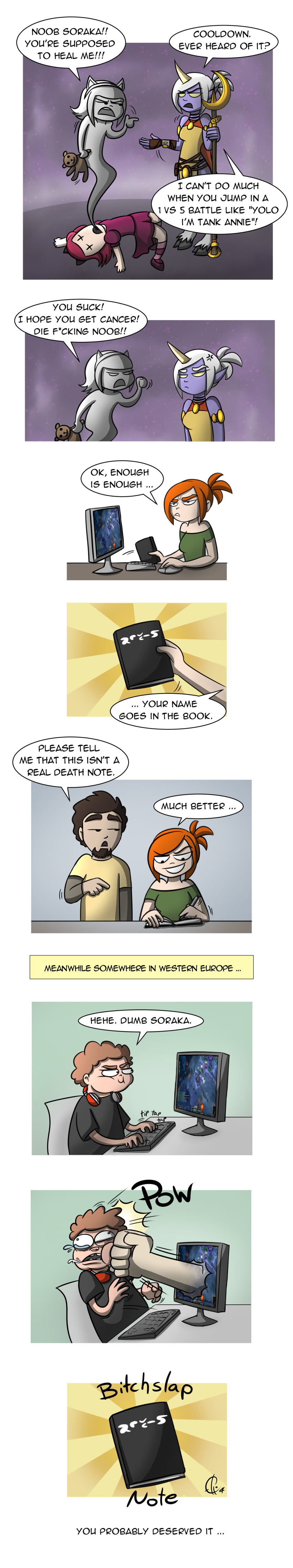 Based on a true story (yeah I own that book, no I won't let you use it. With great power comes great responsibility.). I hate how people lose their manners as soon as they are online. There is nothing worse than playing a support for a brat like that ...