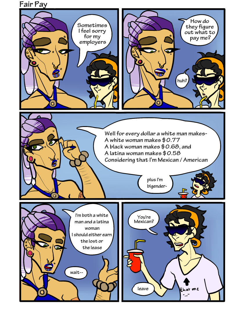 Following a bigender masculine Mexican, their 2 romantic partners and their insecure employee, Feelin' Uncomfortable? is a collection of short comics confronting topics that I used to make the school board as uncomfortable as possible about the harsh realities of life.