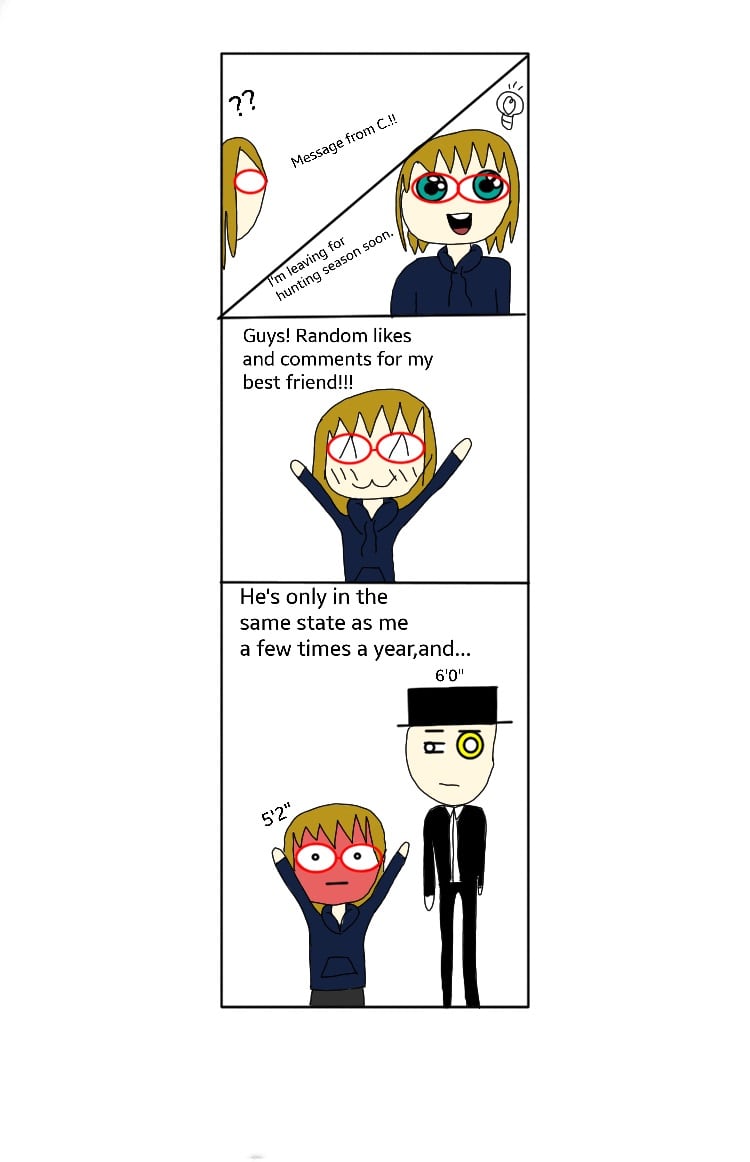So,C. is in the same state as me for once,and I wanna surprise him with as many comments and likes as possible!! If you're confused about C.,he requested to be drawn differently than what he looks like in real life...XD (He really is six feet tall,though.And I'm midget. T.T )And,yes.We are both 16.