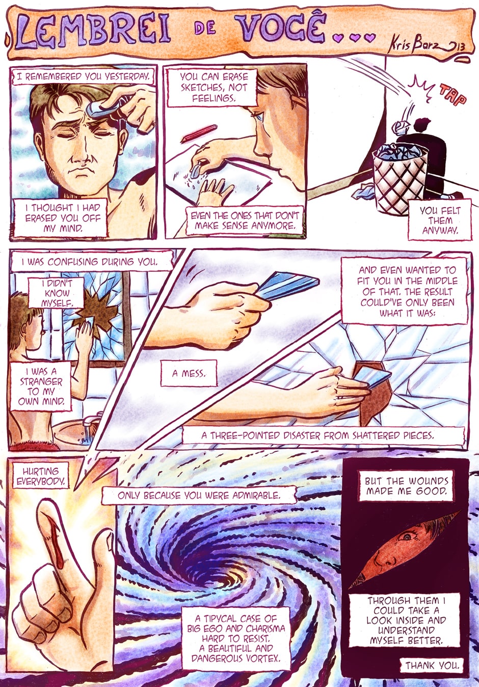 We all struggle with love and everything related to it. Each person has a different concept of what love is and a lot of times the suffering we put ourselves in is caused by what we expect love to be. "I remembered you" (from Portuguese "Lembrei de você") is a series of one-page stories from a very introspective week back in 2013. I was feeling a little hopeless and frustrated after years of problematic, unresolved or failed relationships. So I started remembering each and every person I had loved or been in love with (masochist much?) and started writing what came to my mind. I soon noticed that was my way of doing therapy, realizing we can all learn with good and bad things and even be thankful for them.