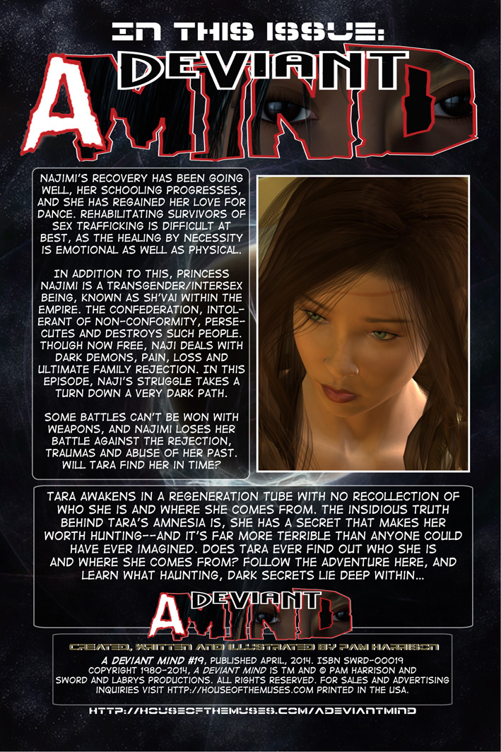 In addition to this, princess Najimi is a transgender/intersex being, known as Sh’Vai within the empire. The Confederation, intolerant of non-conformity, persecutes and destroys such people. Though now free, Naji deals with dark demons, pain, loss and